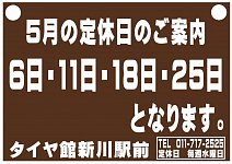 こんにちは(^^)/ 5月の定休日のお知らせです!! 05/04(水)は祝日の為、営業いたします(^-^) 代わりに05/06(金)が定休日となりますので お間違えのないようお願い致します。 皆様のご来店お待ちしております♪
