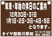 こんにちは。 いつもブログをご覧いただきありがとうございます。 11月26日から12月26日まで長くに渡り 歳末決算セールをさせていただきました!!! 期間中には沢山の方にご来店頂きました。 ありがとうございます(*^^*) セールは終わりましたが、タイヤ館は年内まだまだ営業しています。 12月29日...