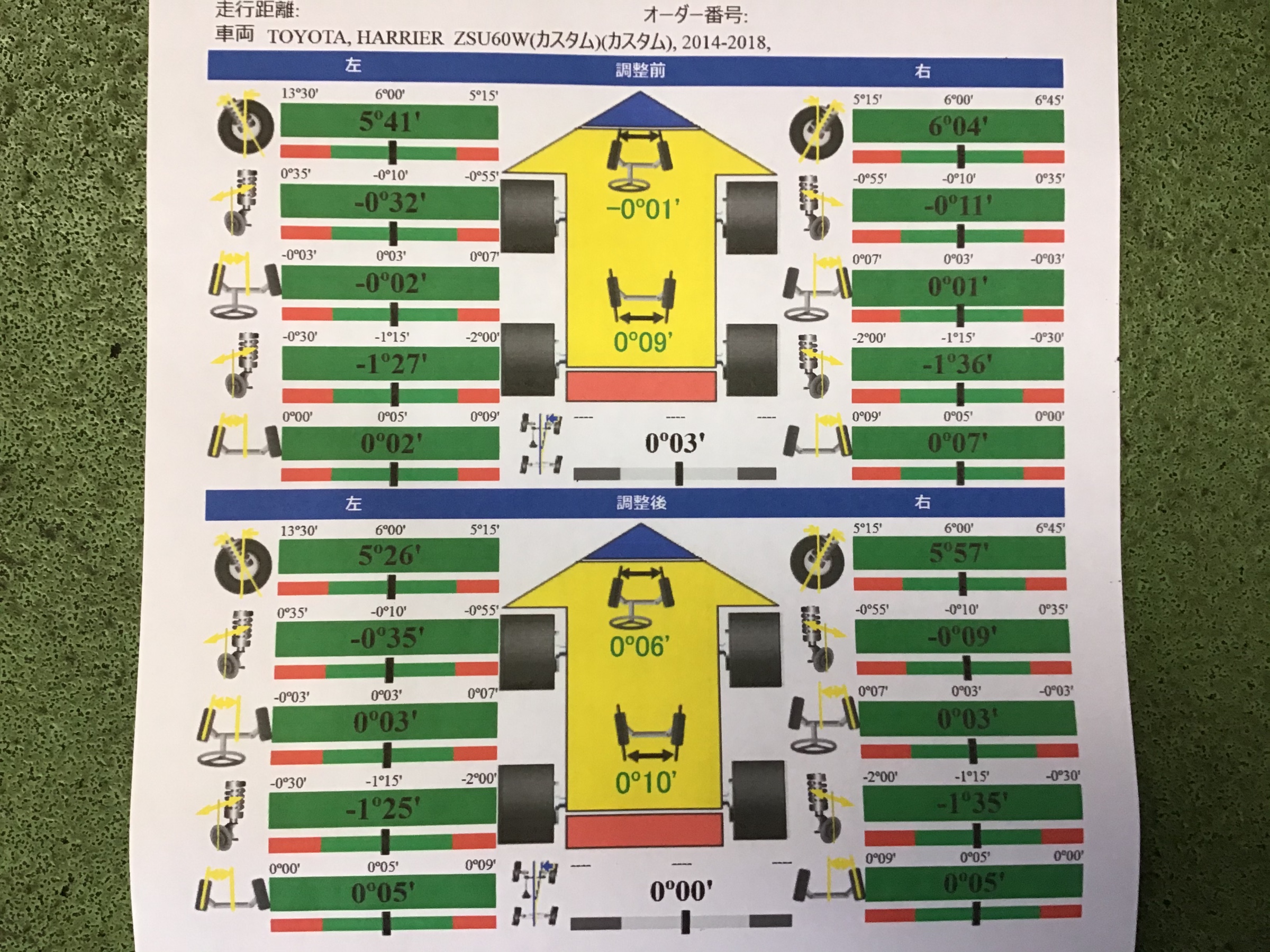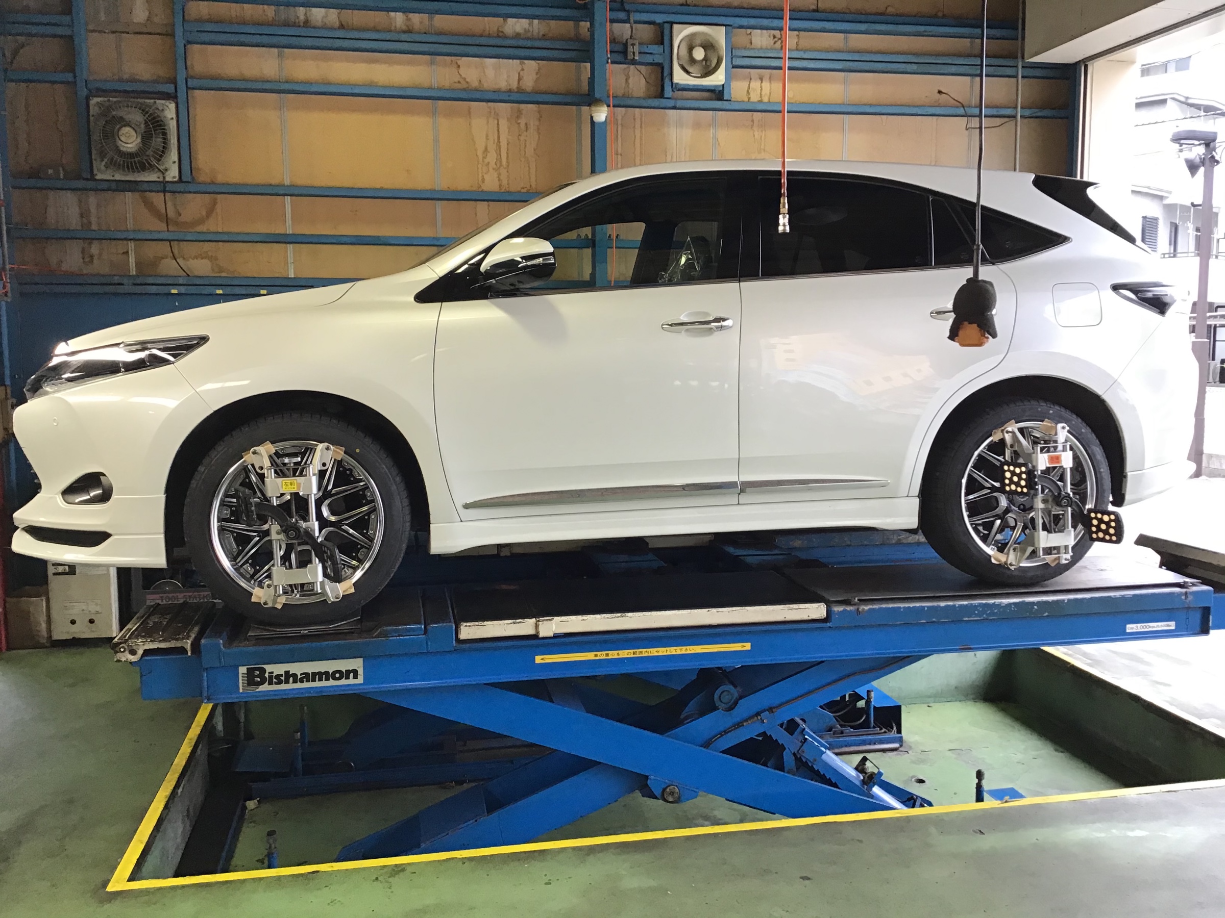本日はトヨタ ハリアーのアライメント調整作業を実施しました