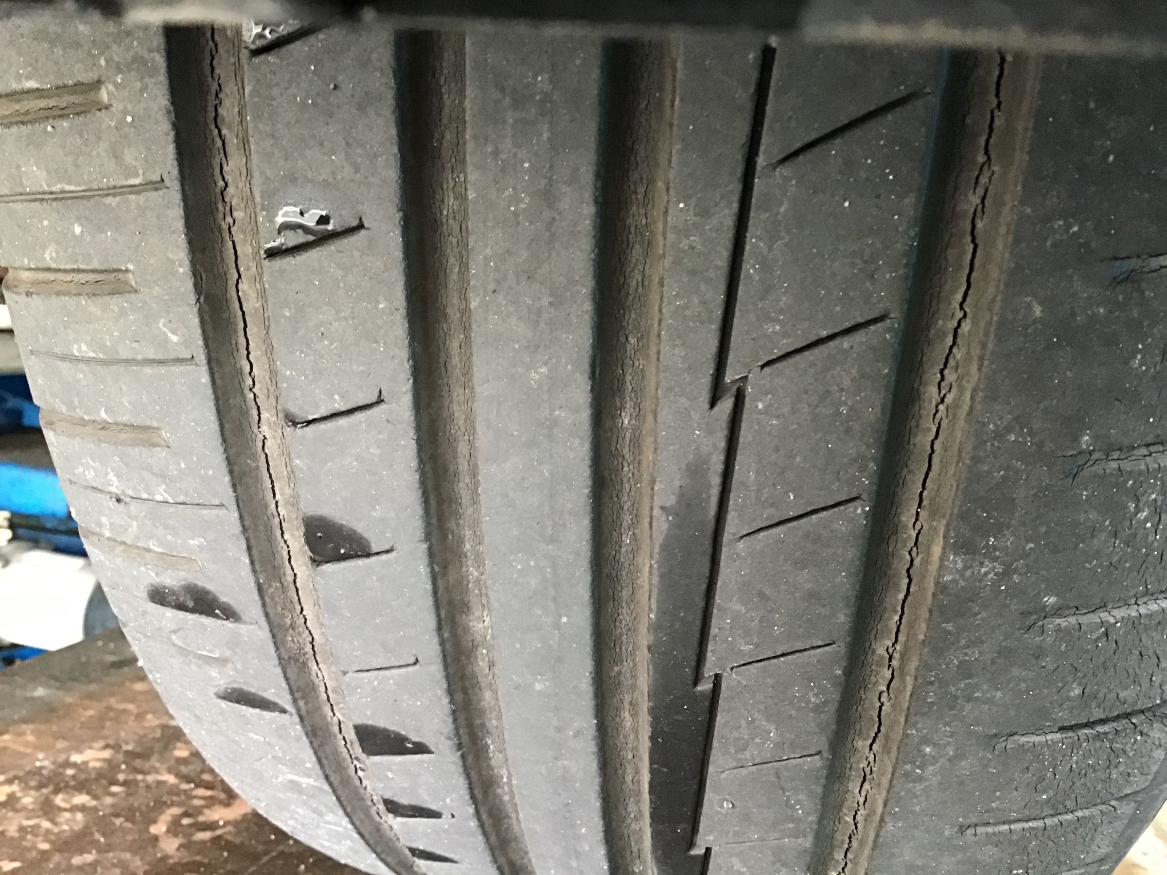 このヒビは交換目安の一つです。タイヤの外側は見ても、設置面の部分をじっくり見る方も少ないので気付きにくい箇所ですよね(´・ω・`)