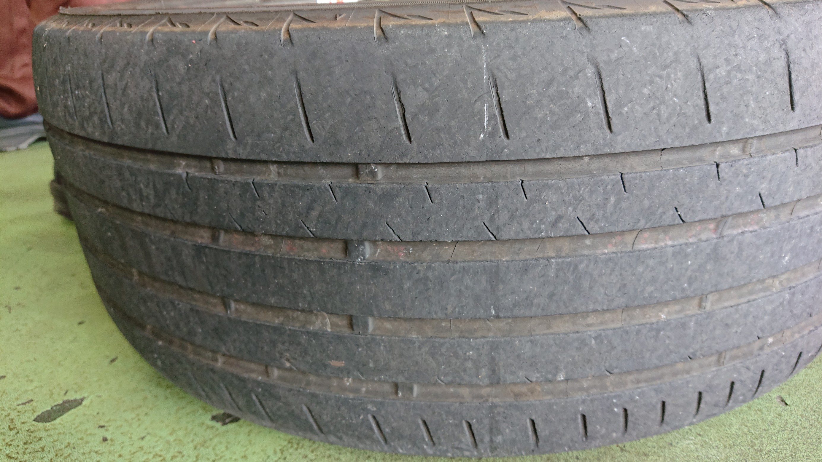 センター摩耗以外の偏摩耗が出ていたので、この後アライメント調整まで実施しています。