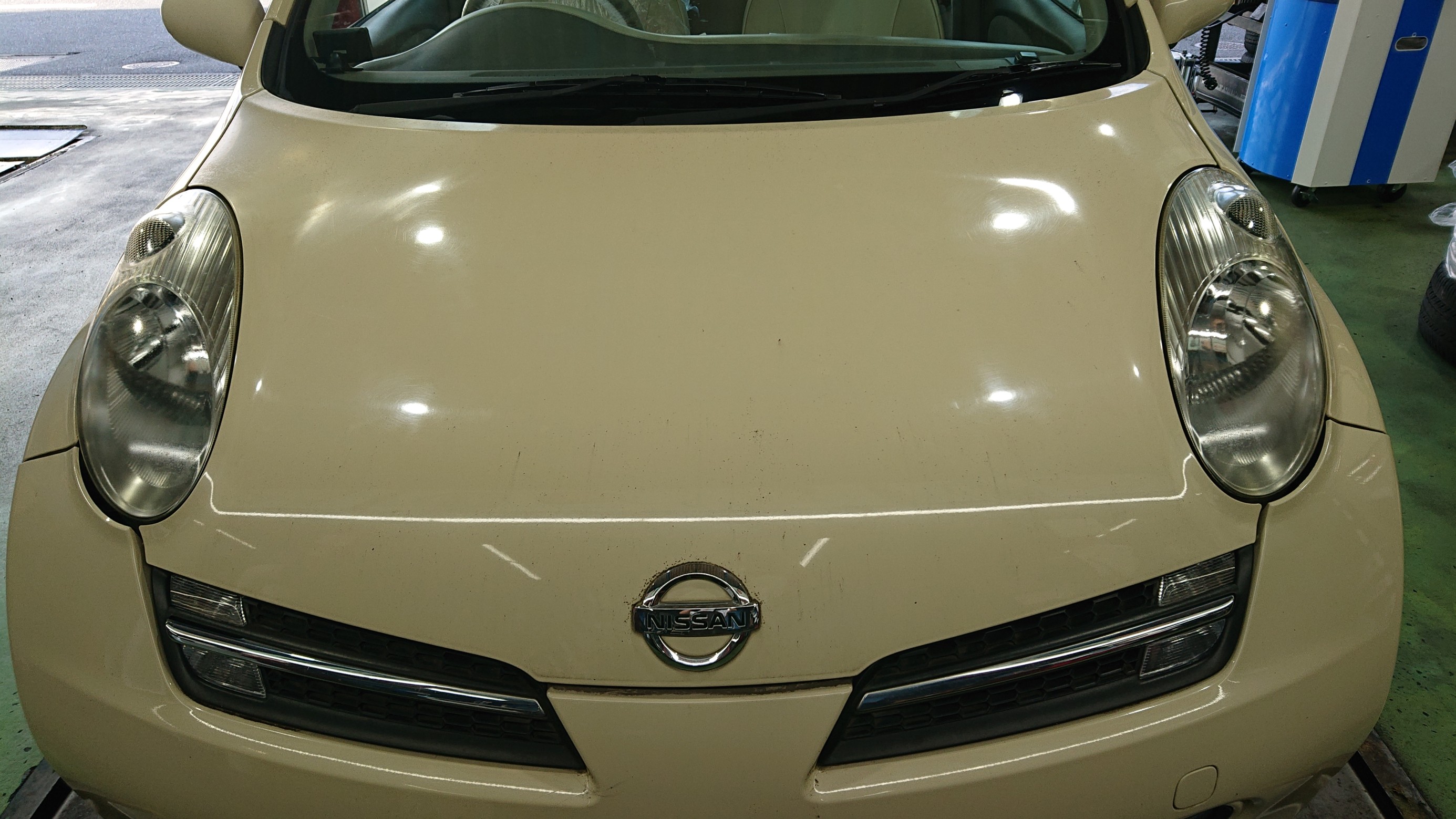 一番上の画像(横から見たマーチ)のヘッドライトを見てみると非常に黄ばみが凄い。ぽつぽつと黒い汚れも。