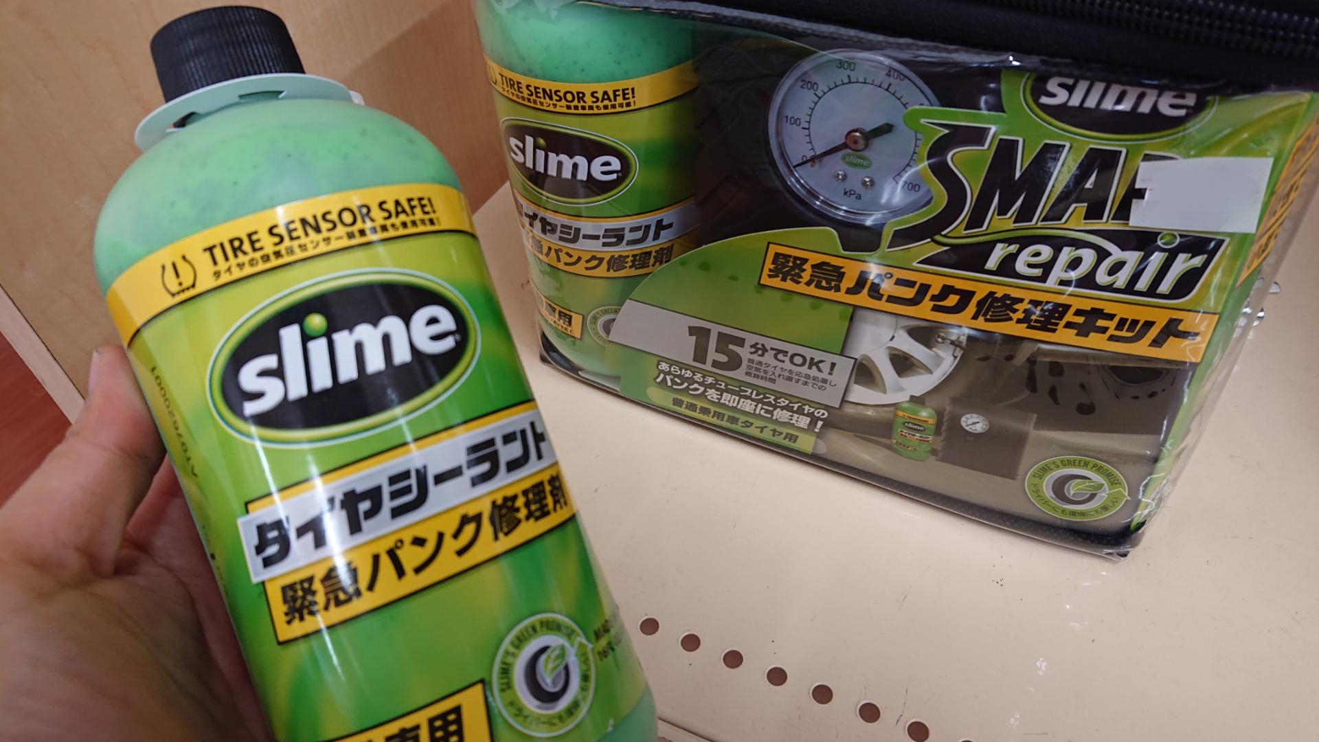 コンプレッサー付きの「slime スマートリペア(緊急パンク修理キット)」もあります。