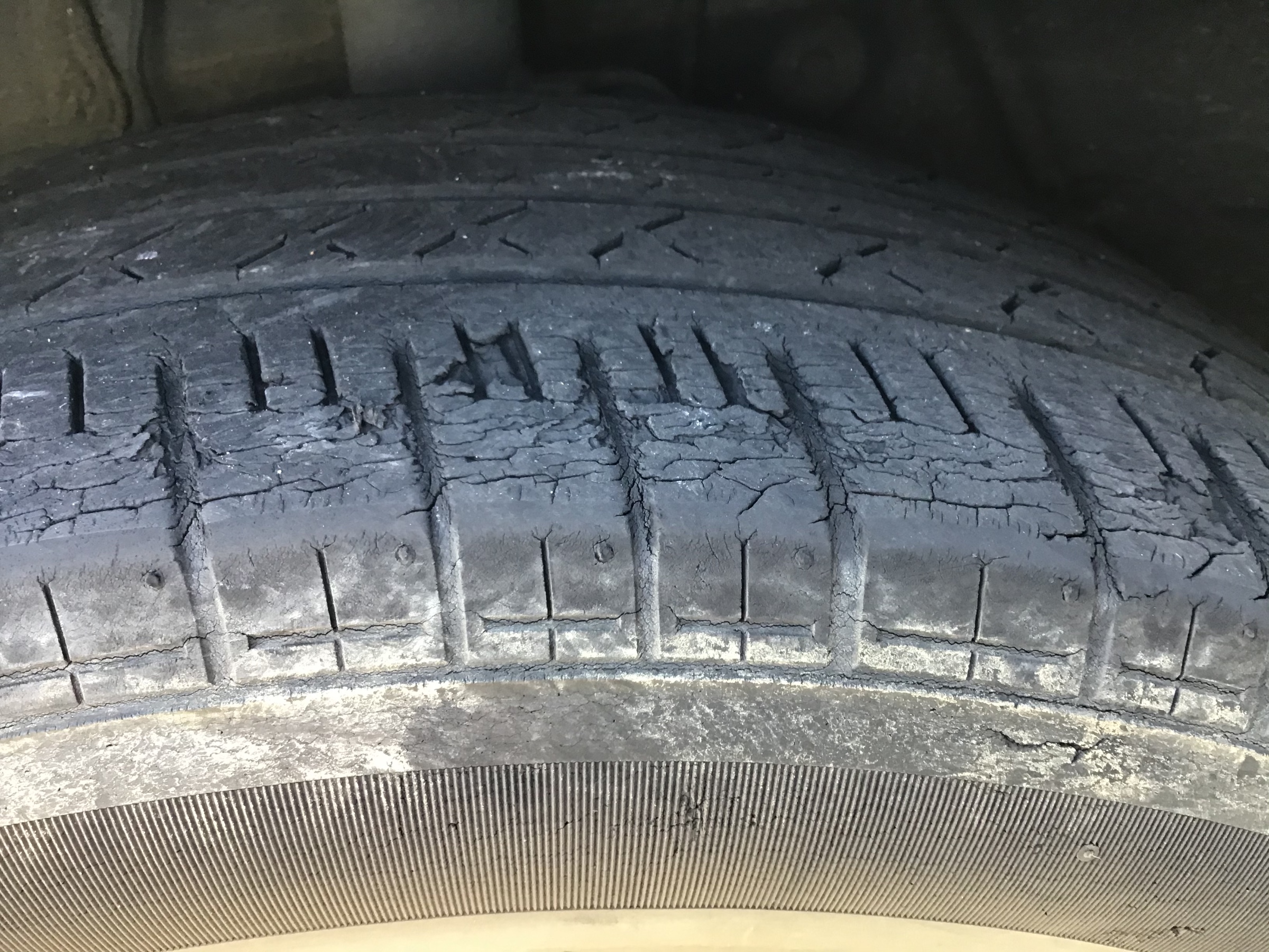 経年劣化からの硬化→ヒビが徐々に深く入る→走行によるトレッド部分のゴムの欠け・剥がれ