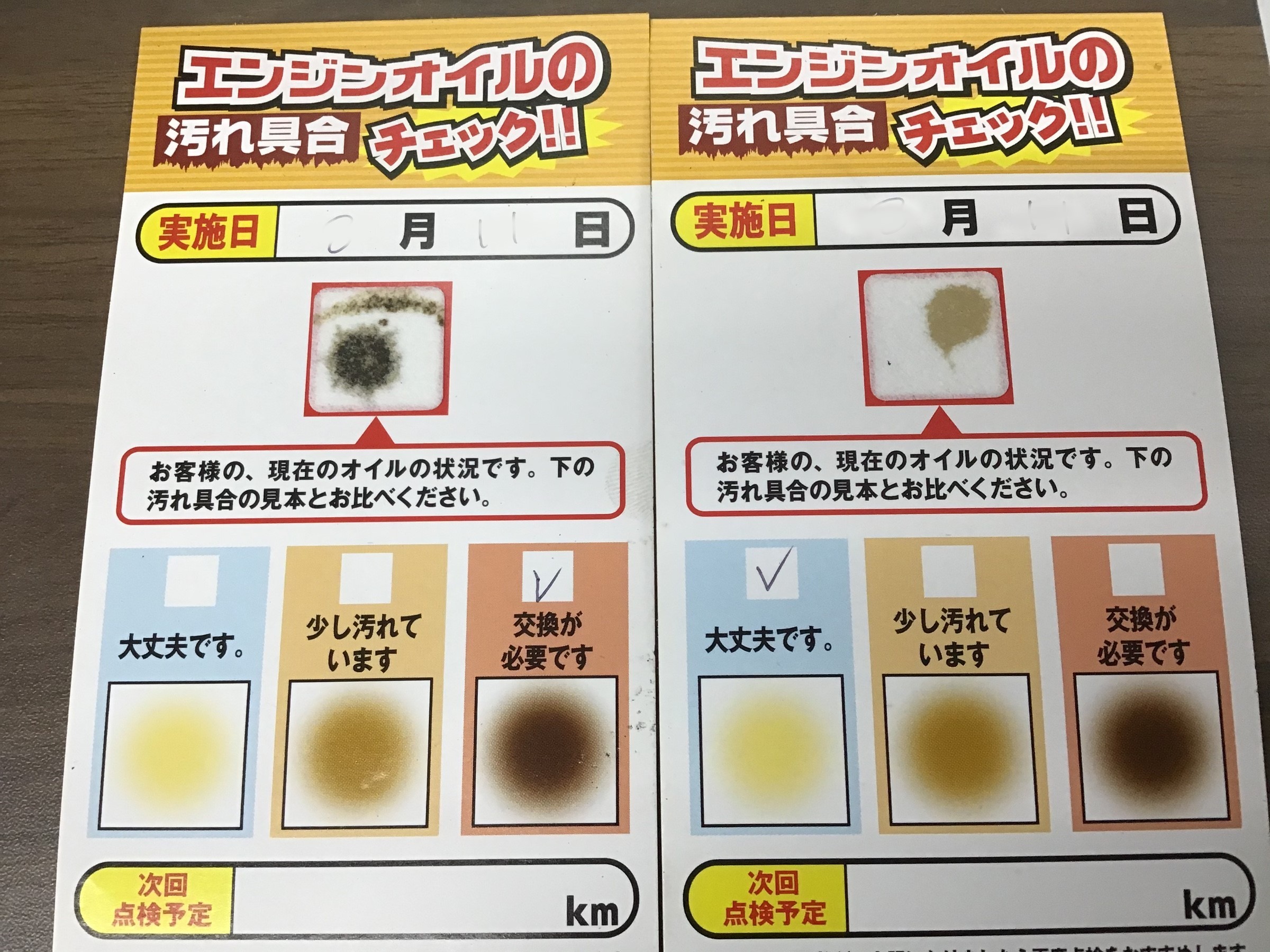 右:エンジンオイル交換後にチェックしたもの(新油)