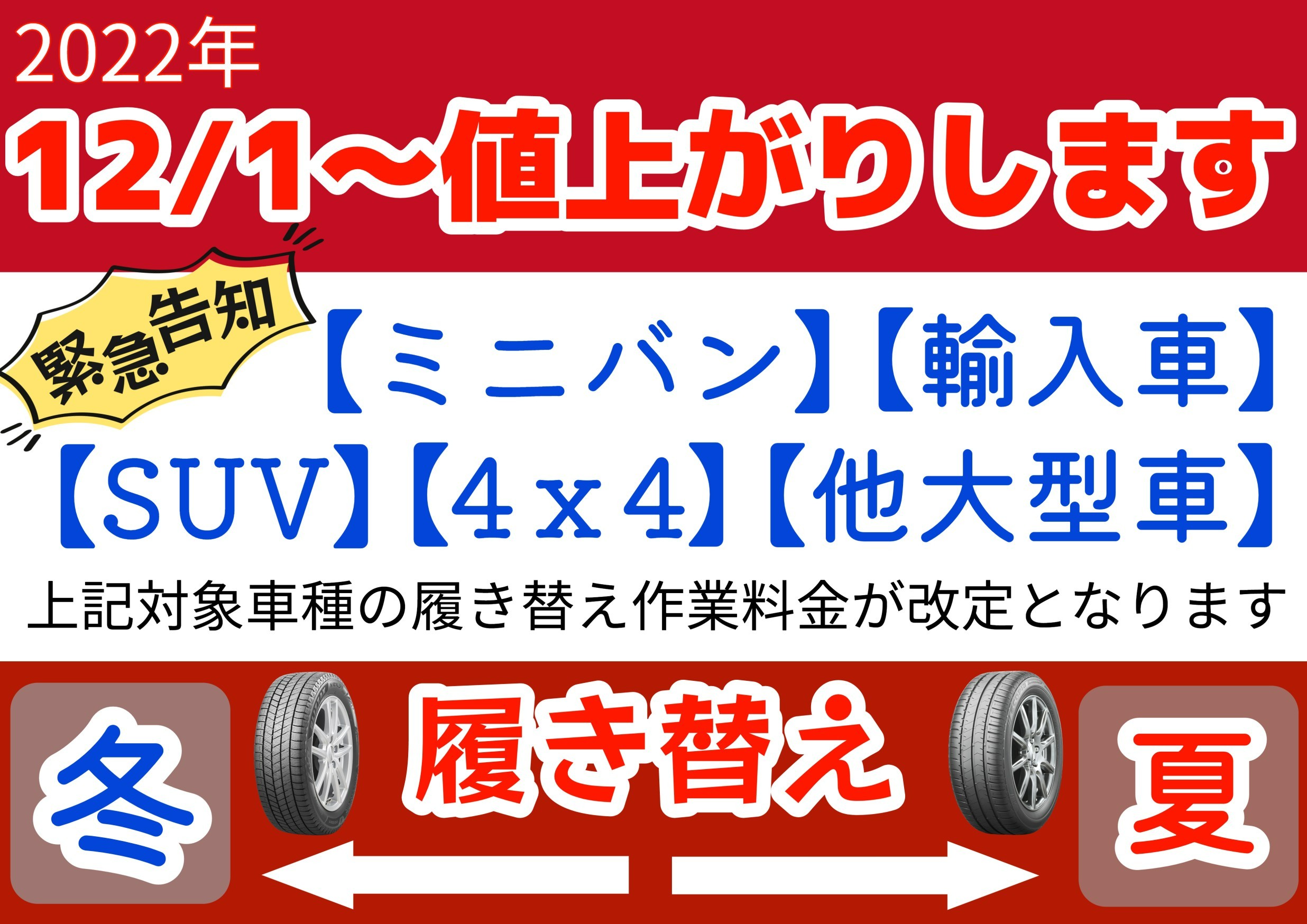 この度、2022年12月1日より、タイヤの履き替え料金を値上げ致します。