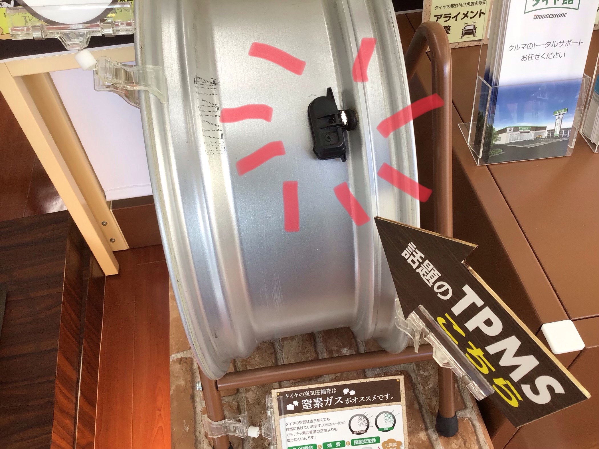 ・発信機(送信機)はゴムバルブの代わりにホイールの内側から付ける形になります。内蔵電池式ですが6~8年程持つので、一般的なタイヤの交換サイクル(3~4年)には十分対応します。電池が切れないかぎりは使えますので、たとえタイヤを交換したとしてもセンサーはそのまま使用できます!