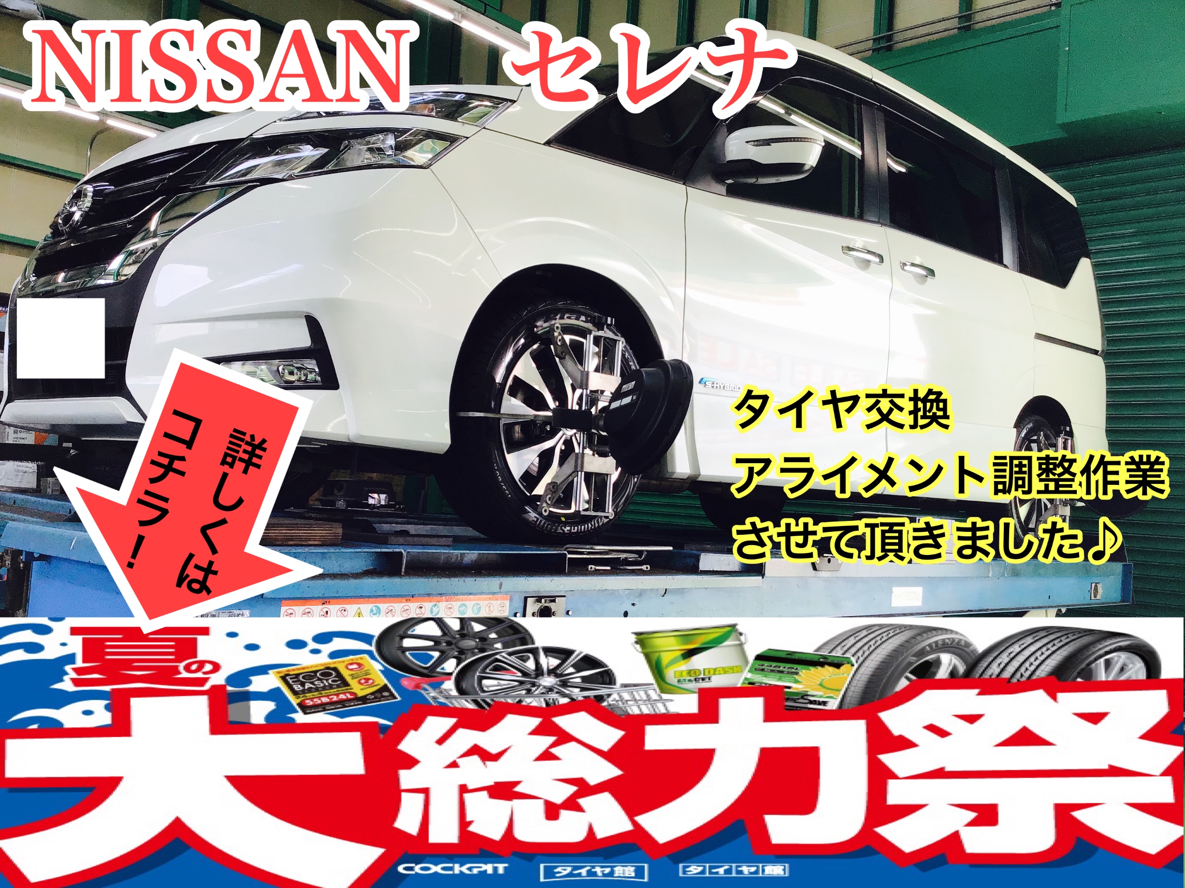 セレナのタイヤ交換とアライメント調整作業させて頂きました♪