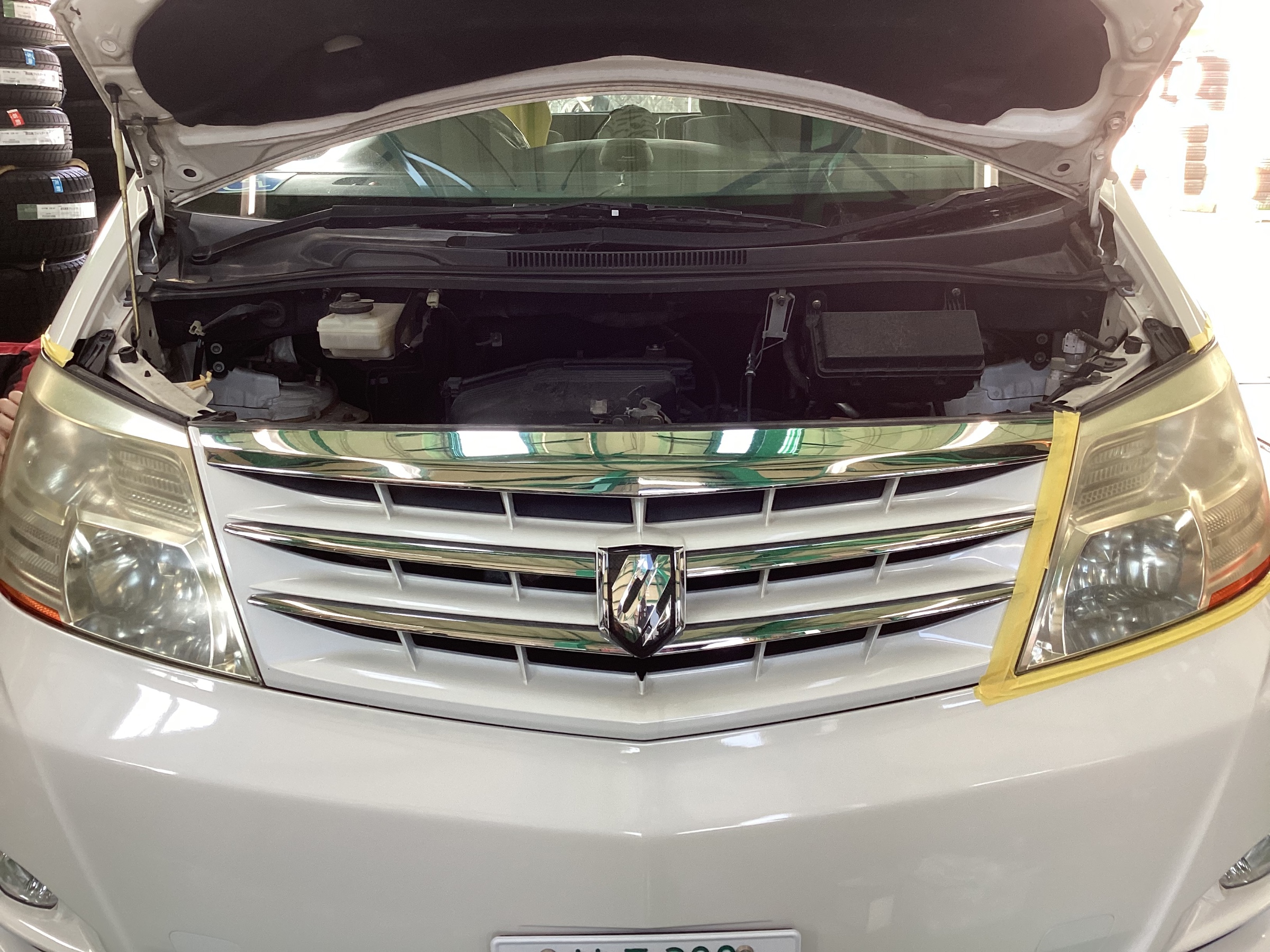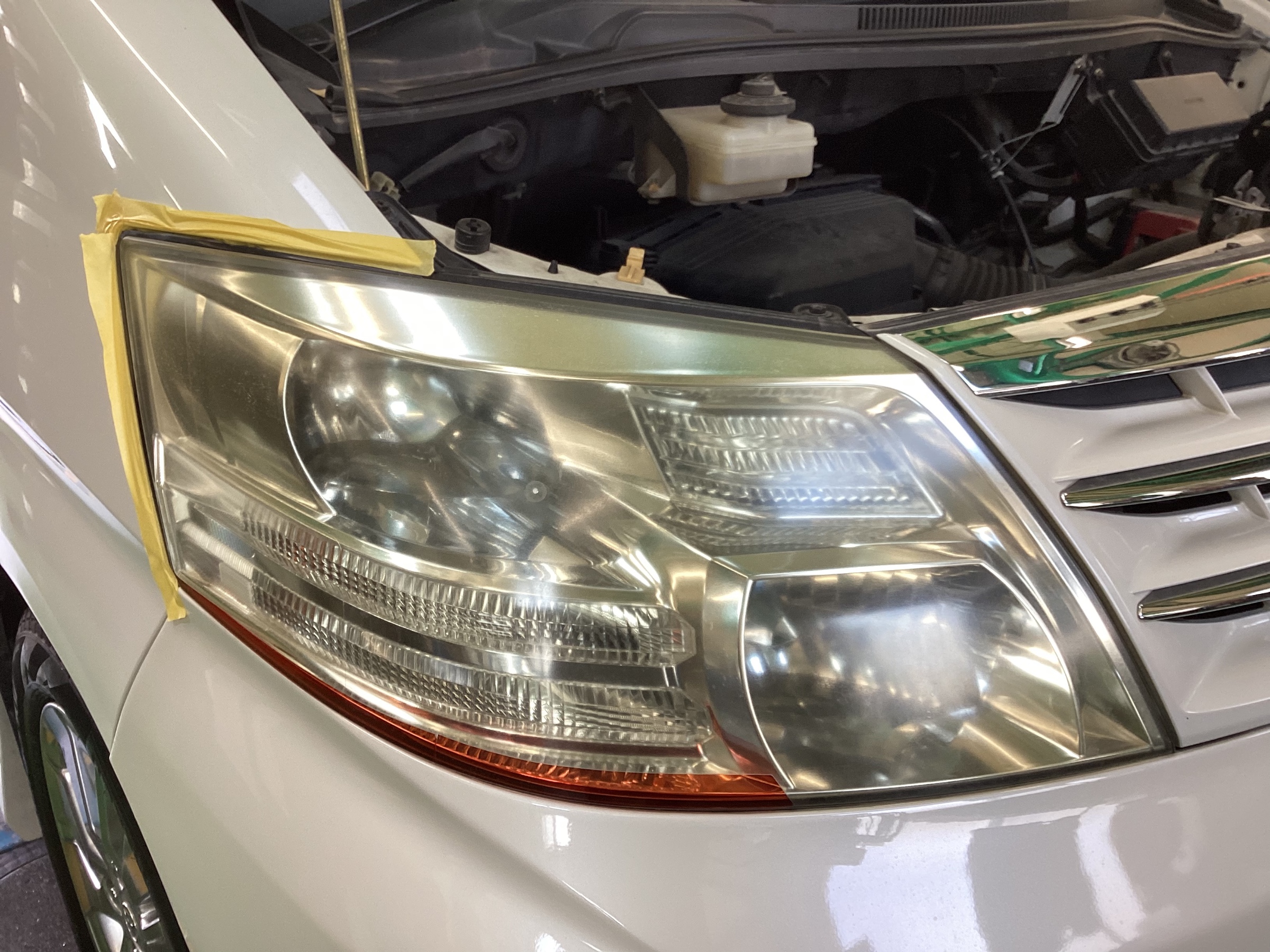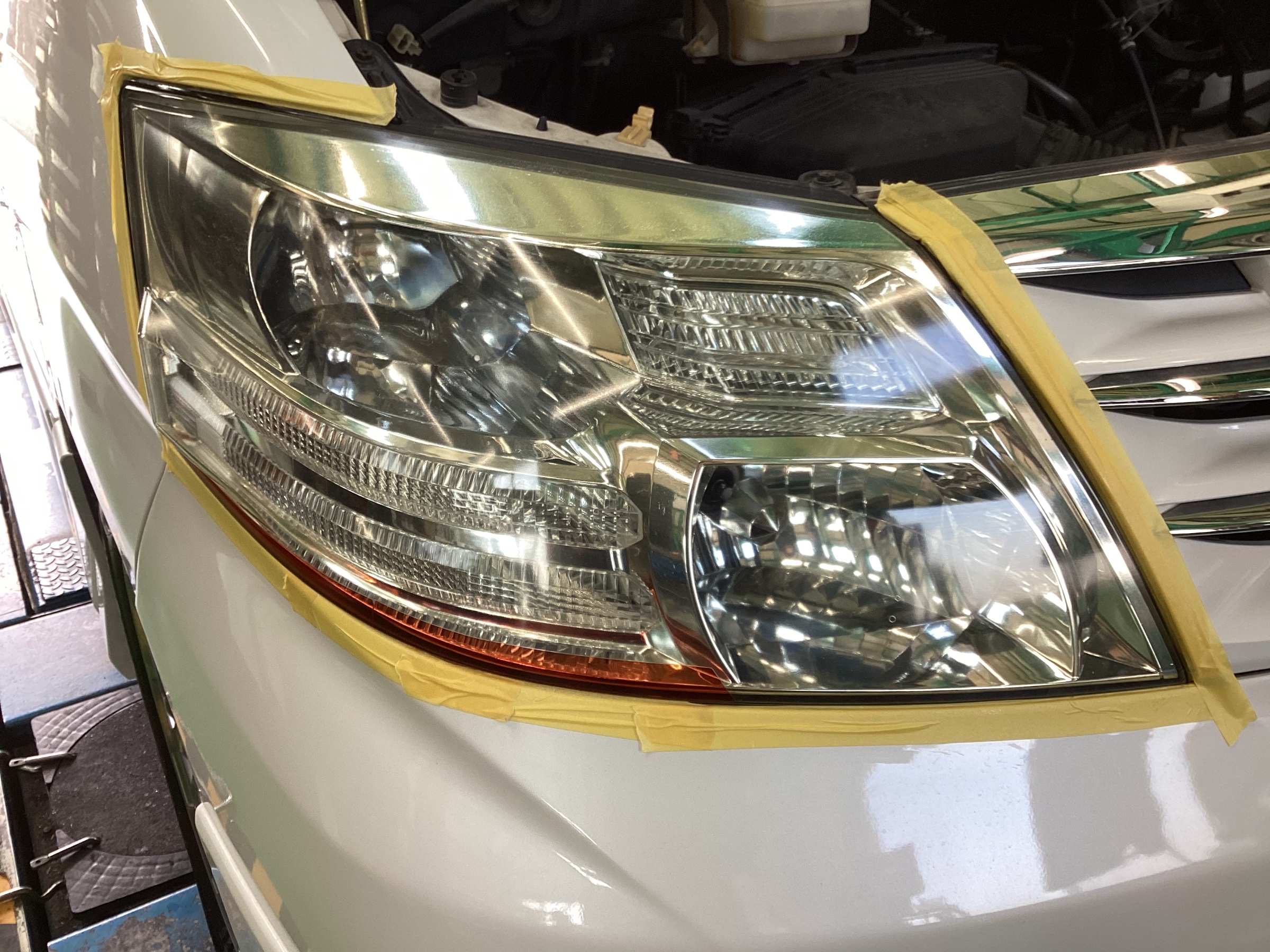 作業工程は大きくわけて2段階。レンズ周りをマスキングテープで養生し、ヘッドライト専用のコンパウンド(研磨剤)でレンズ表面の黄ばみやくすみをきれいにはがします。ただし、これだけですとまた劣化が進んでしまうので、コーティング剤を塗布することで、輝きを取り戻したレンズを守ります。