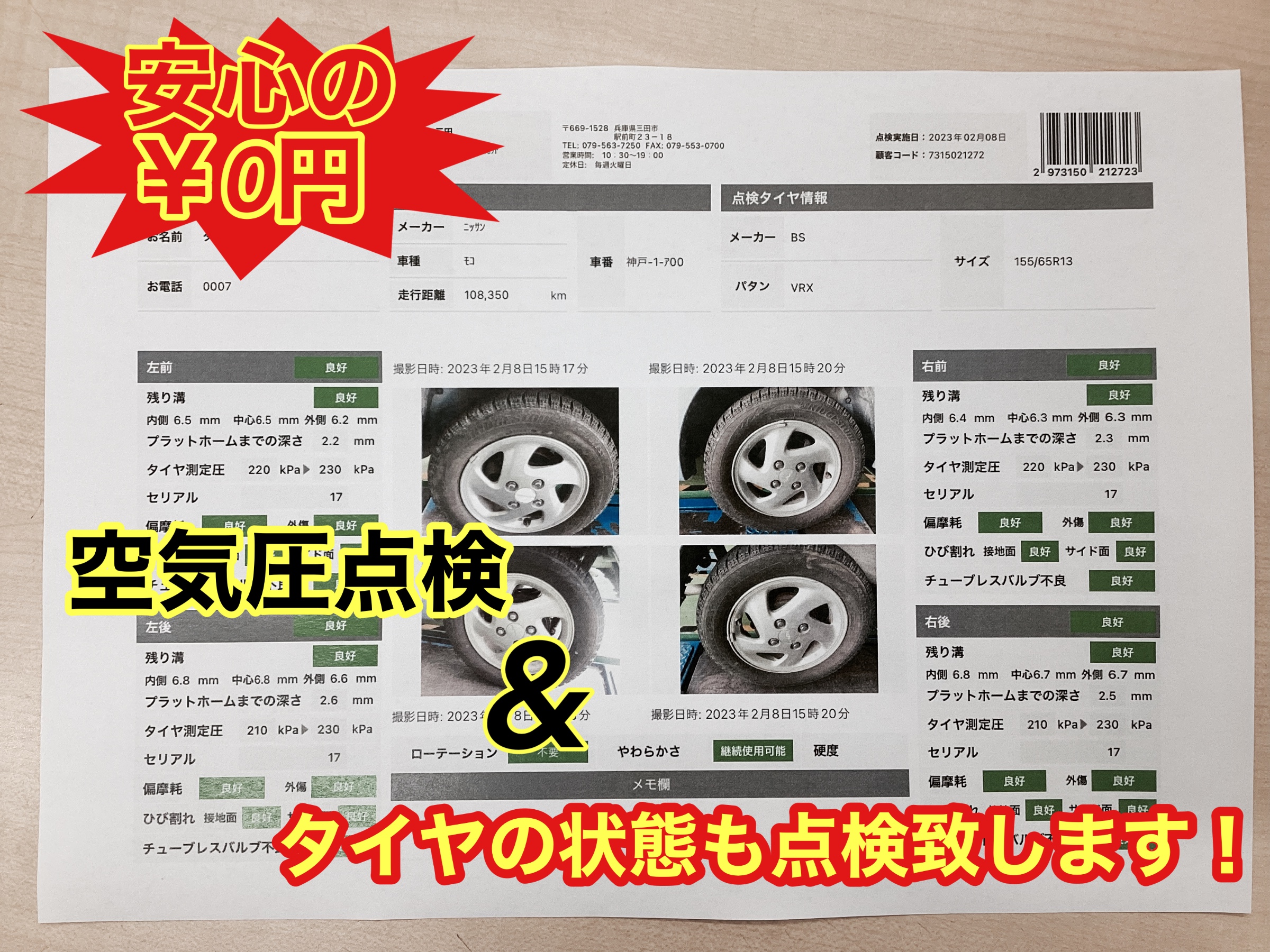 専用器具でしっかりタイヤの点検も無料でさせて頂き