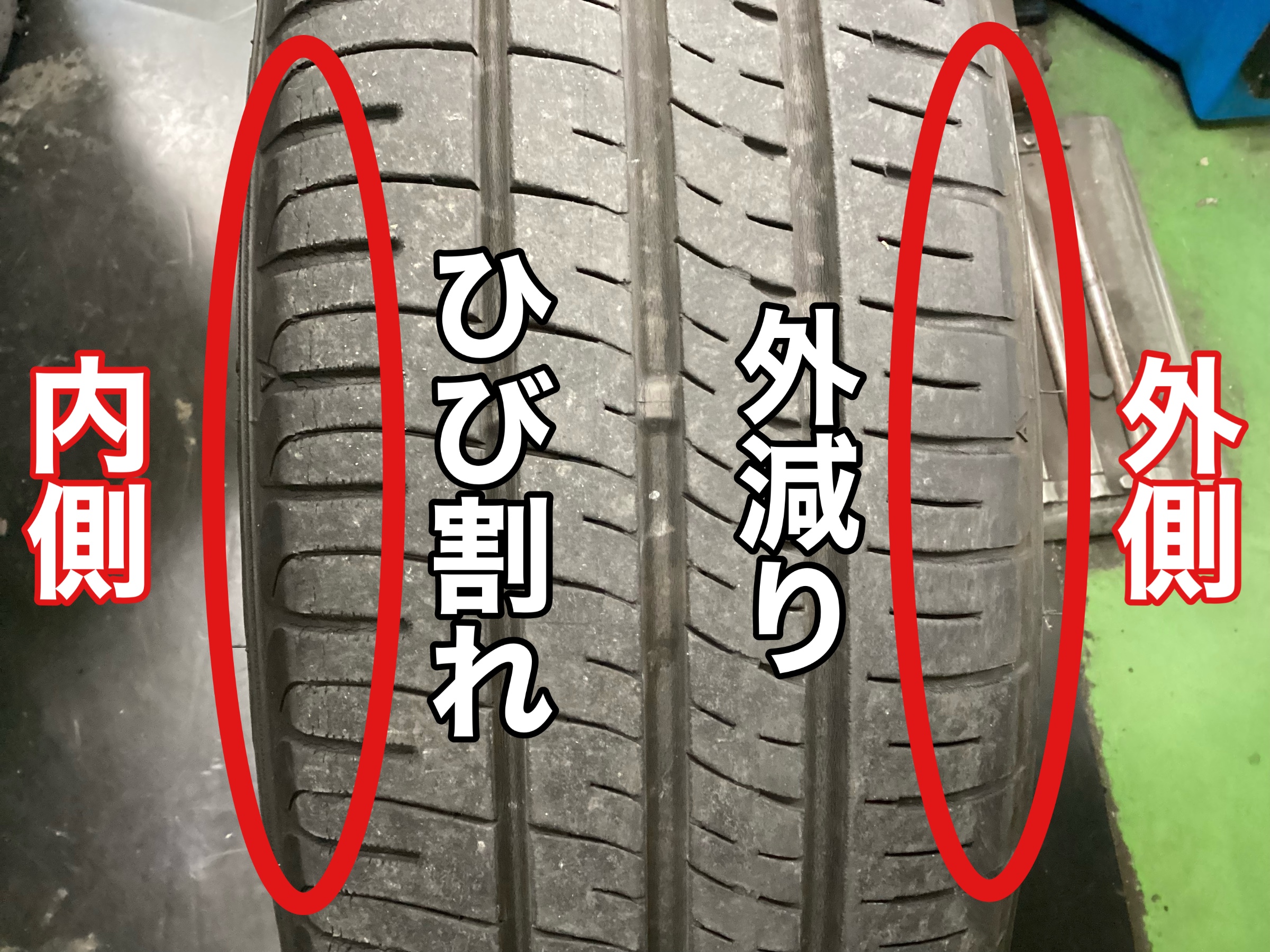 タイヤの外側は過剰に溝が減っていて