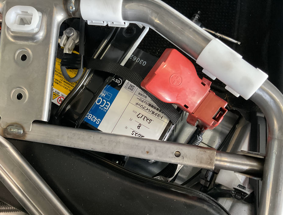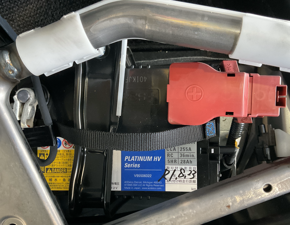 手前の赤いカバーがついているのが今回交換する補器バッテリーです。