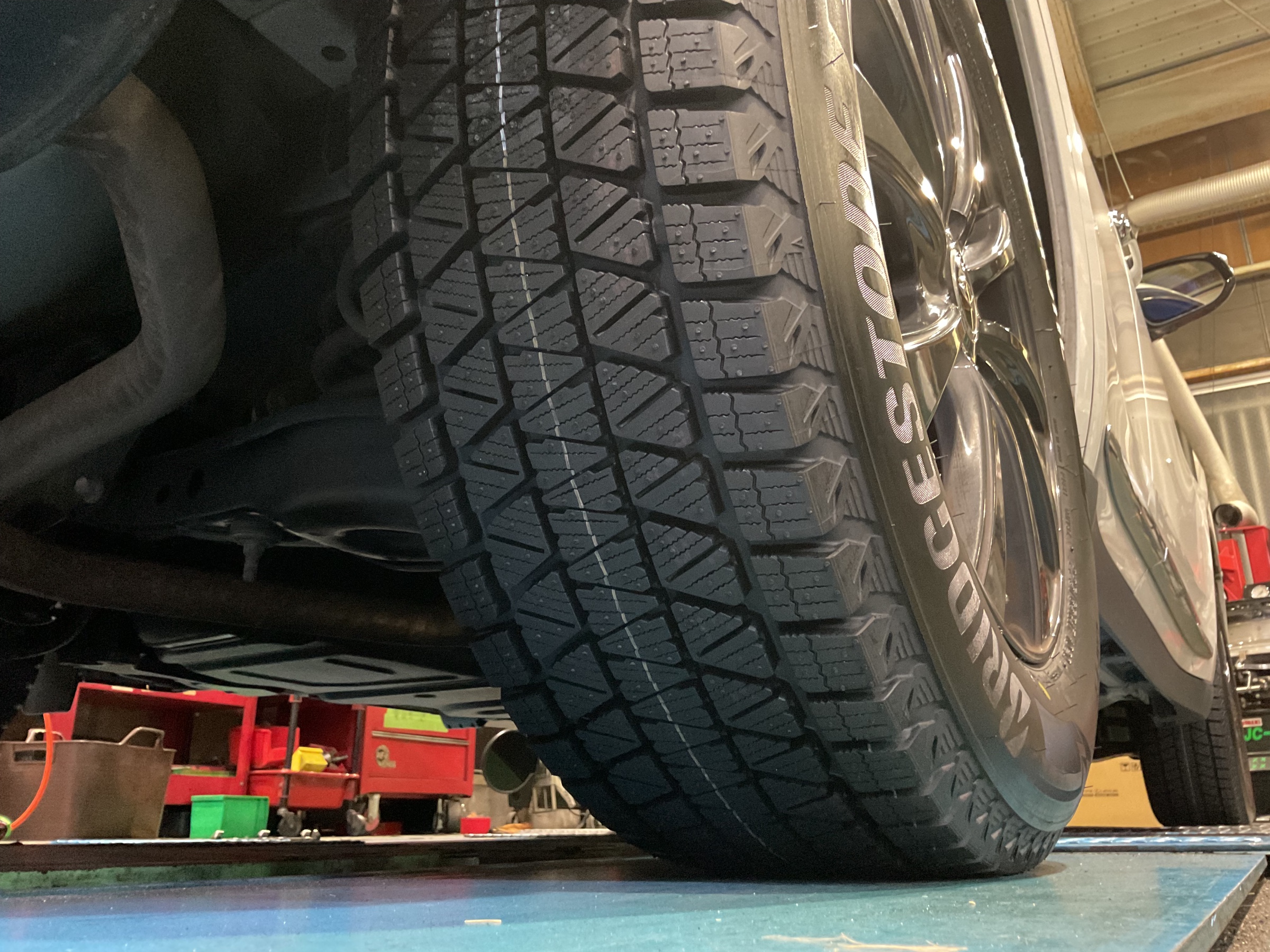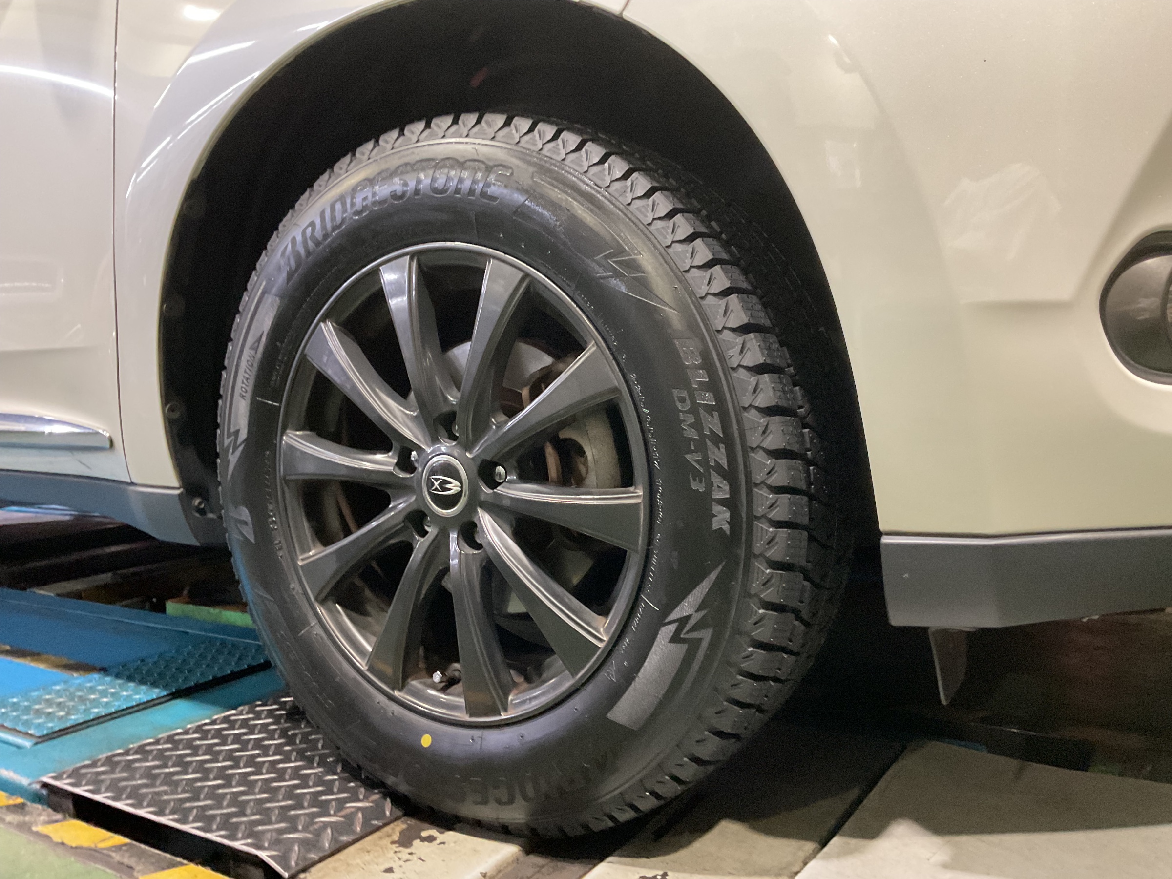 スタッドレスタイヤ交換作業です。SUV専用「ブリヂストン BLIZZAK DM−V3」を装着させていただきました。