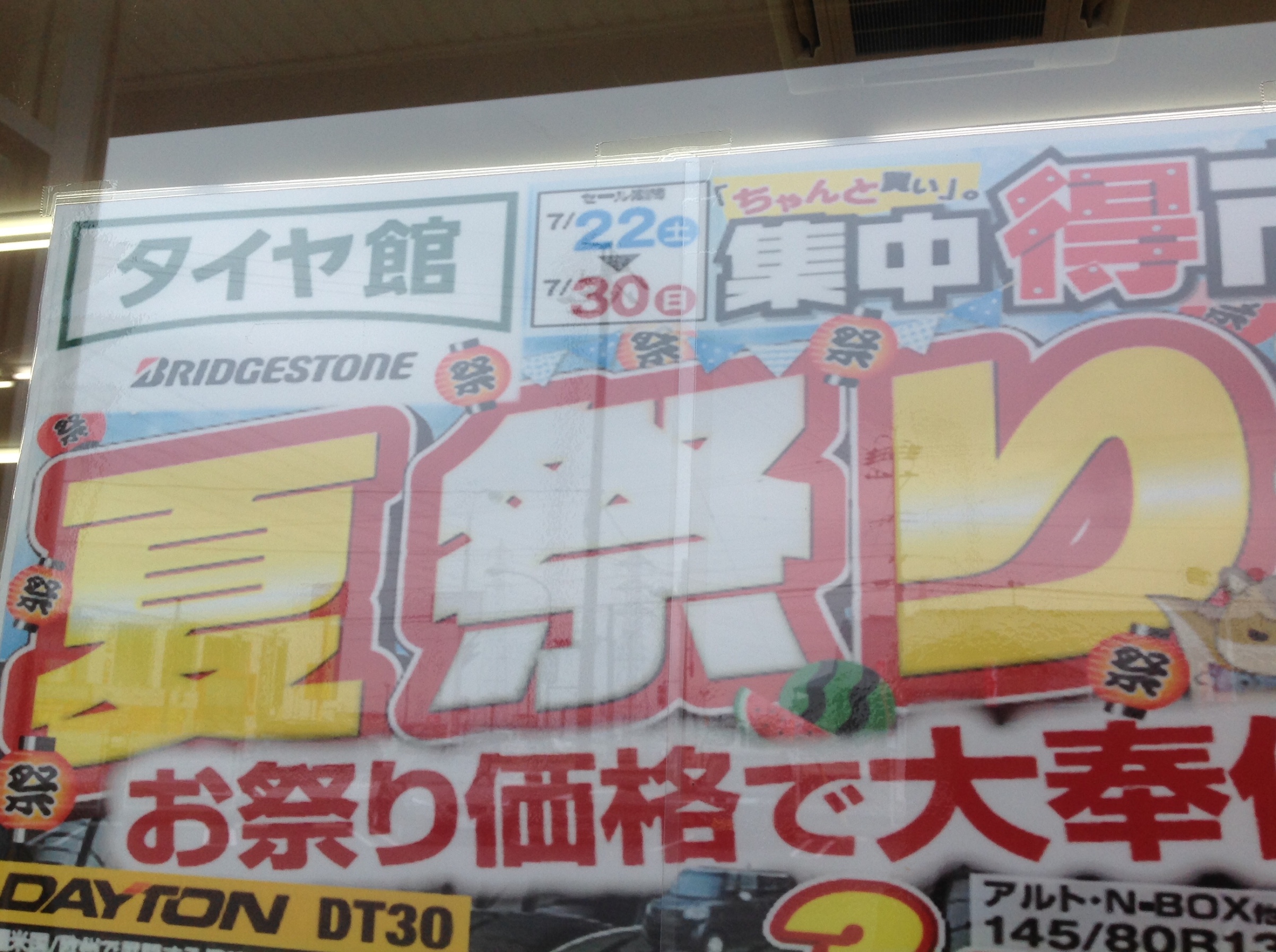 タイヤ館で只今開催中の売り出し、『夏祭り』も 折り返しのあと残り4日です!! ドライブの要!!お車のケアはタイヤ館にお任せください。 ※明日、26日水曜日は定休日になります。
