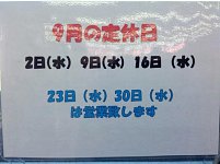 こんにちは。 第258回目のブログでゴメン! 略してブロゴメです。 9月も残すところあと3日ですっ!!! HPをご覧いただいているお客様におしらせ★ 9月30日っ 9月最後の日、水曜日なんですが・・・ 営業致します。 それでは今回は これにてゴメン!!