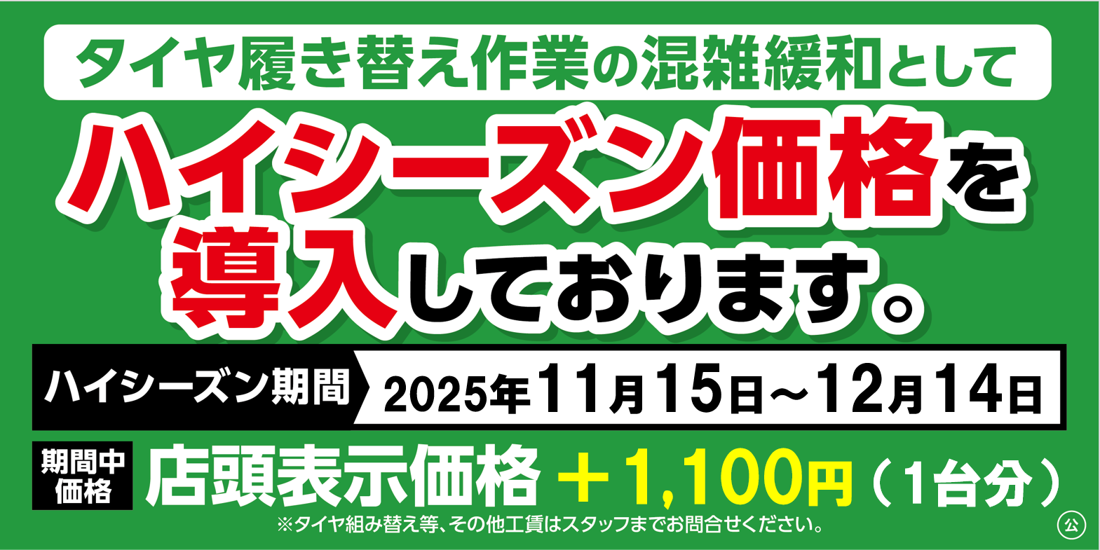 ー脱着ハイシーズン価格のお知らせー 2025年9月15日 タイヤ館白河ホームページをご覧いただきありがとうございます。 タイヤ履き替え料金 ハイシーズン価格導入のお知らせです。 ハイシーズン中の混雑緩和の為、何卒ご了承ください。 また、作業予約はWEBからがオススメです。 WEB予約はこちらから ぜひご利用下さい。