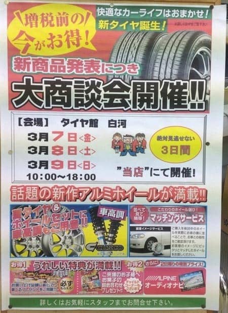 同時にタイヤ館集中得市も開催中、増税前の最後の月です。