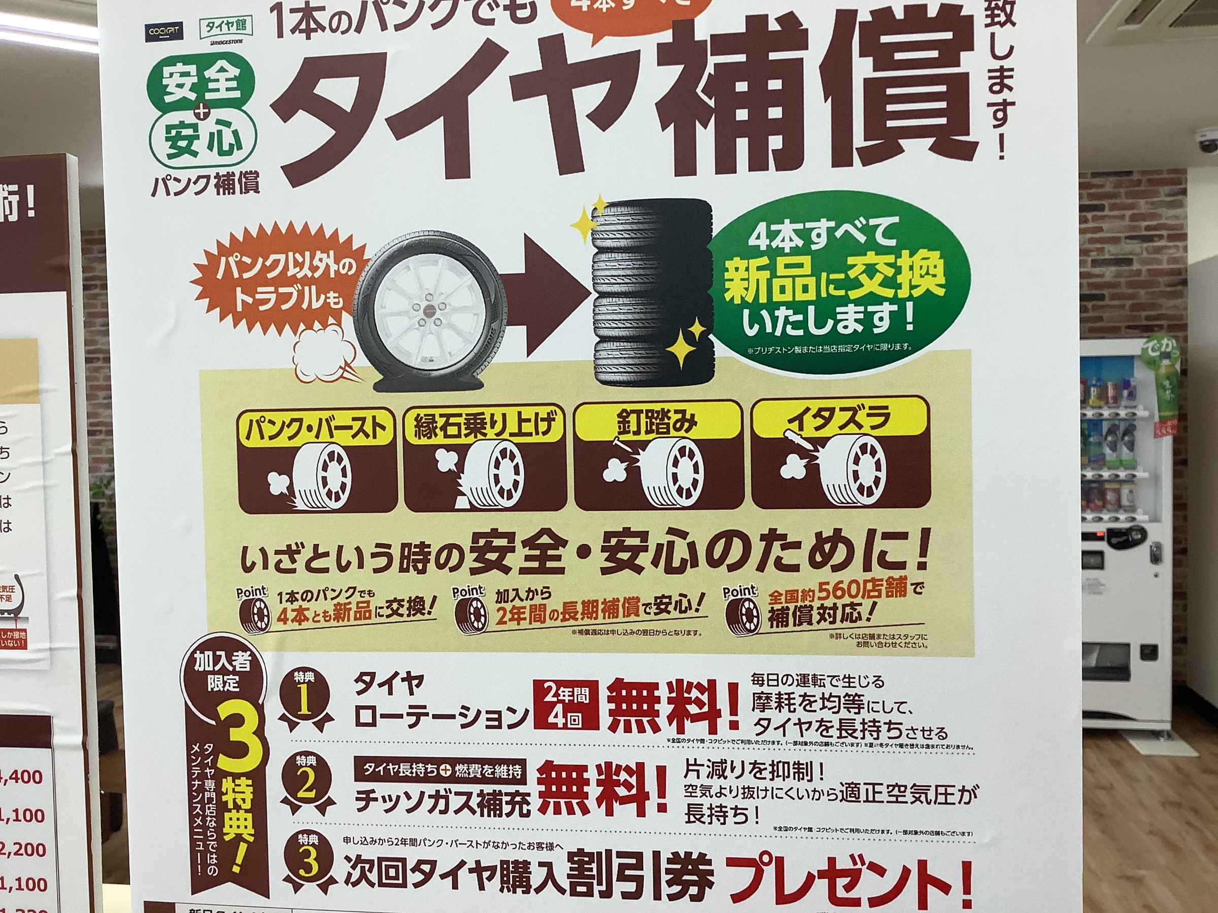 こちらに加入していますと1本でもパンクしたら4本新品に交換できるという保険です。