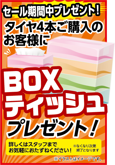 タイヤご成約のお客様にティッシュBOXプレゼント!!!!