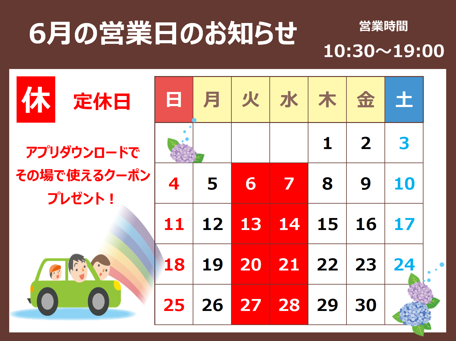 6月6日(火曜日)、6月7日(水曜日)は定休日となります。