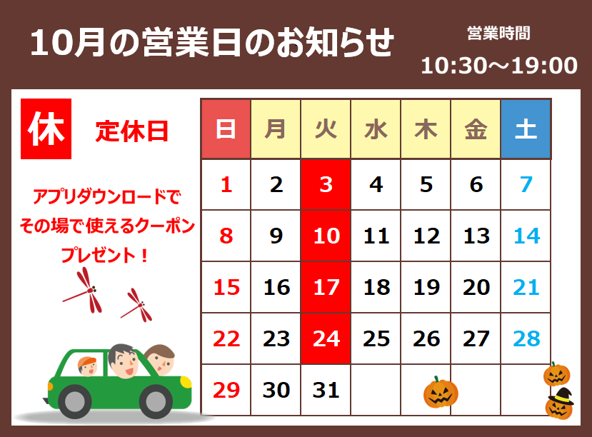 【タイヤ館白河】定休日のお知らせ ポスト 2023年10月9日 定休日のご案内です。 明日10月3日(火曜日)は定休日となります。 ご理解ご協力の程よろしくお願い致します。 ご予約はweb(B-pit)からも出来ますので 是非ご利用ください。 タイヤ館 白河 住所:961-0985福島県白河市和尚壇6-17 相談予約 タイヤ点検・安全点検/タイヤ履き替え/オイル交換/その他ピット作業の予約