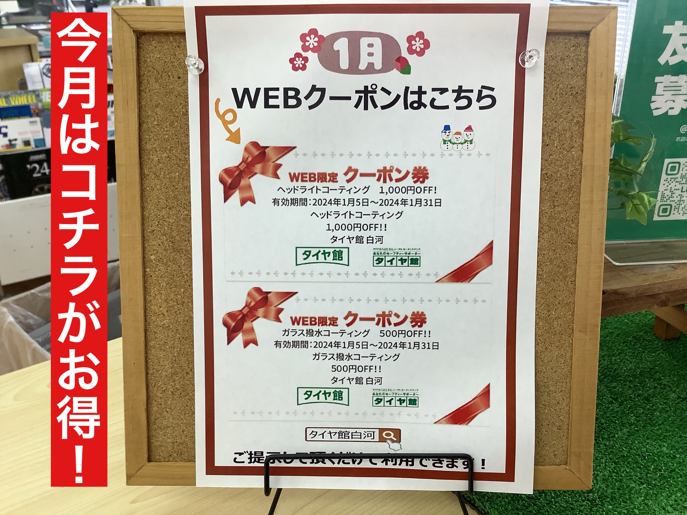 【タイヤ館白河】WEBを見た方へ!1月限定WEBクーポン! ポスト 2024年1月27日 1月限定WEBクーポンやってます! 今月はコチラ! ヘッドライトコーティング:1000円OFF! フロントガラス撥水コーティング:500円OFF! 詳しくは&ご利用はコチラ! ご提示だけでご利用いただけますので、お得なチャンスをお見逃しなく♪ タイヤ館 白河 住所:961-0985福島県白河市和尚壇6-17 相談予約 タイヤ点検・安全点検/タイヤ履き替え/オイル交換/その他ピット作業の予約