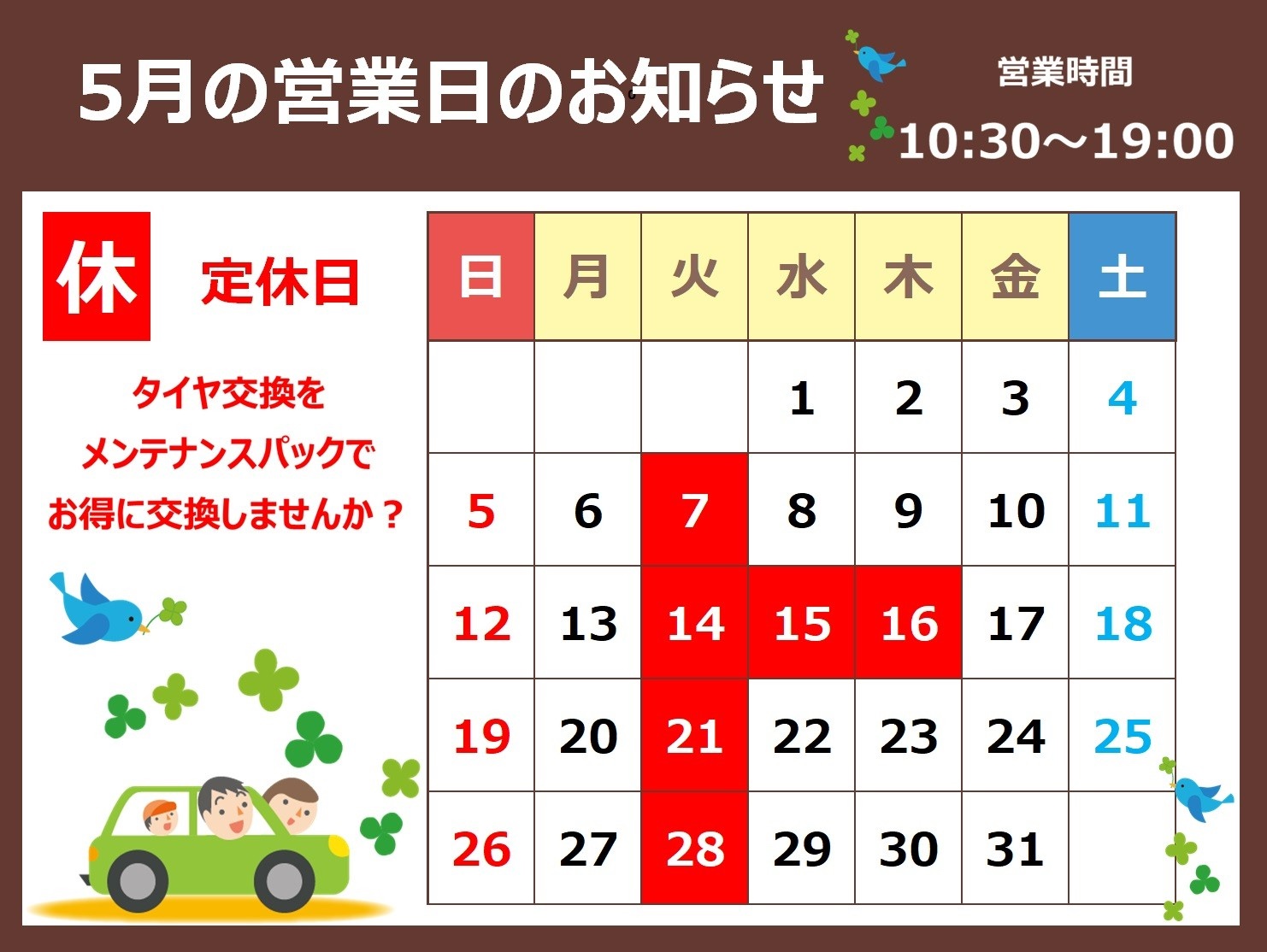 【タイヤ館 白河】明日5/28(火)は定休日です【お知らせ】 ポスト 2024年5月28日 タイヤ館白河ホームページをご覧頂きましてありがとうございます! さて、明日5/28(火)は定休日となっております。 ご迷惑お掛けしますが、宜しくお願い致します。 29日(水)からは、通常通り営業しております! 皆様のお越しをお待ちしております★ タイヤ館 白河 住所:961-0985福島県白河市和尚壇6-17 相談予約 タイヤ点検・安全点検/タイヤ履き替え/オイル交換/その他ピット作業の予約