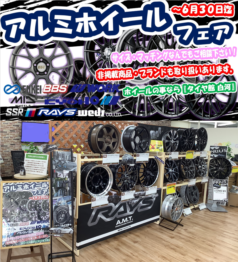【タイヤ館白河】アルミホイールフェア開催中! ポスト 2024年6月1日 白河店限定開催! 【5月25日(土)~6月30日(日)まで】 アルミホイールフェアを開催中!! RAYS・WORK・BBS・Weds・ENKEI SSR・MID・KYOHO etc... ドレスアップをご検討中の方、 ホイール購入をご検討中の方など、 ぜひこの機会にご相談下さい☆ 同時に在庫一掃セールも開催! 店内在庫を売り尽くし! アウトレット品もご用意しておりますので、 ぜひ見に来てください! 皆様のお越しをお待ちしております!!! タイヤ館 白河 住所:961-0985福島県白河市和尚壇6-17 相談予約 タイヤ点検・安全点検/タイヤ履き替え/オイル交換/その他ピット作業の予約