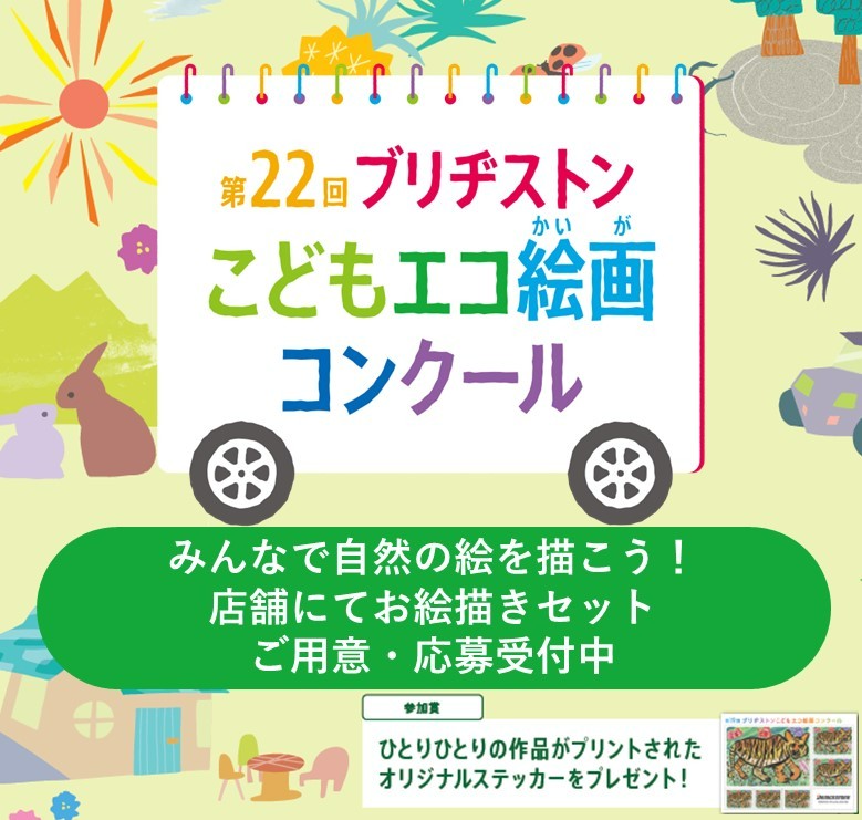 ブリヂストングループでは、子どもたちに環境・自然をテーマに絵を描いてもらい、それを通じて、大人も含めた多くの人々に環境・自然の大切さを伝えていきたいと考え、2003年よりこのコンクールを開催しています。当店舗では、キッズコーナーにてお絵描きセットを展開中!店舗や自宅で描き終わった後、店舗の応募箱にお持ち込みいただくことで応募受付ができます。ぜひ遊びにいらしてください!