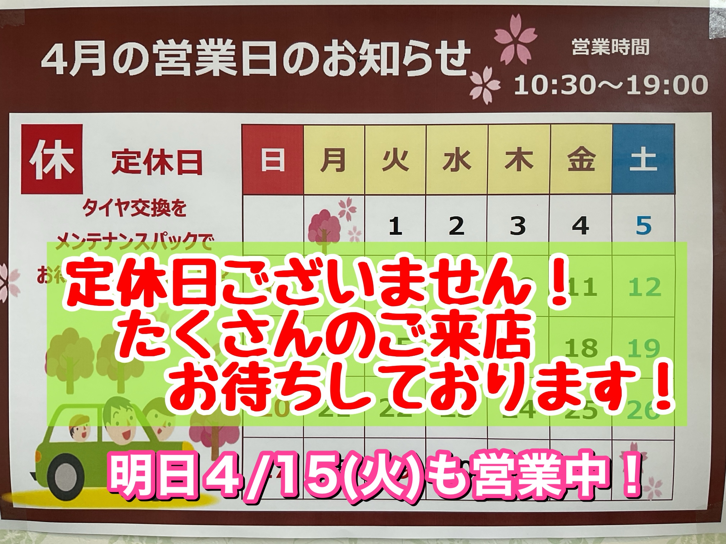 明日4月15日は火曜日ですが、通常通り営業しております!
