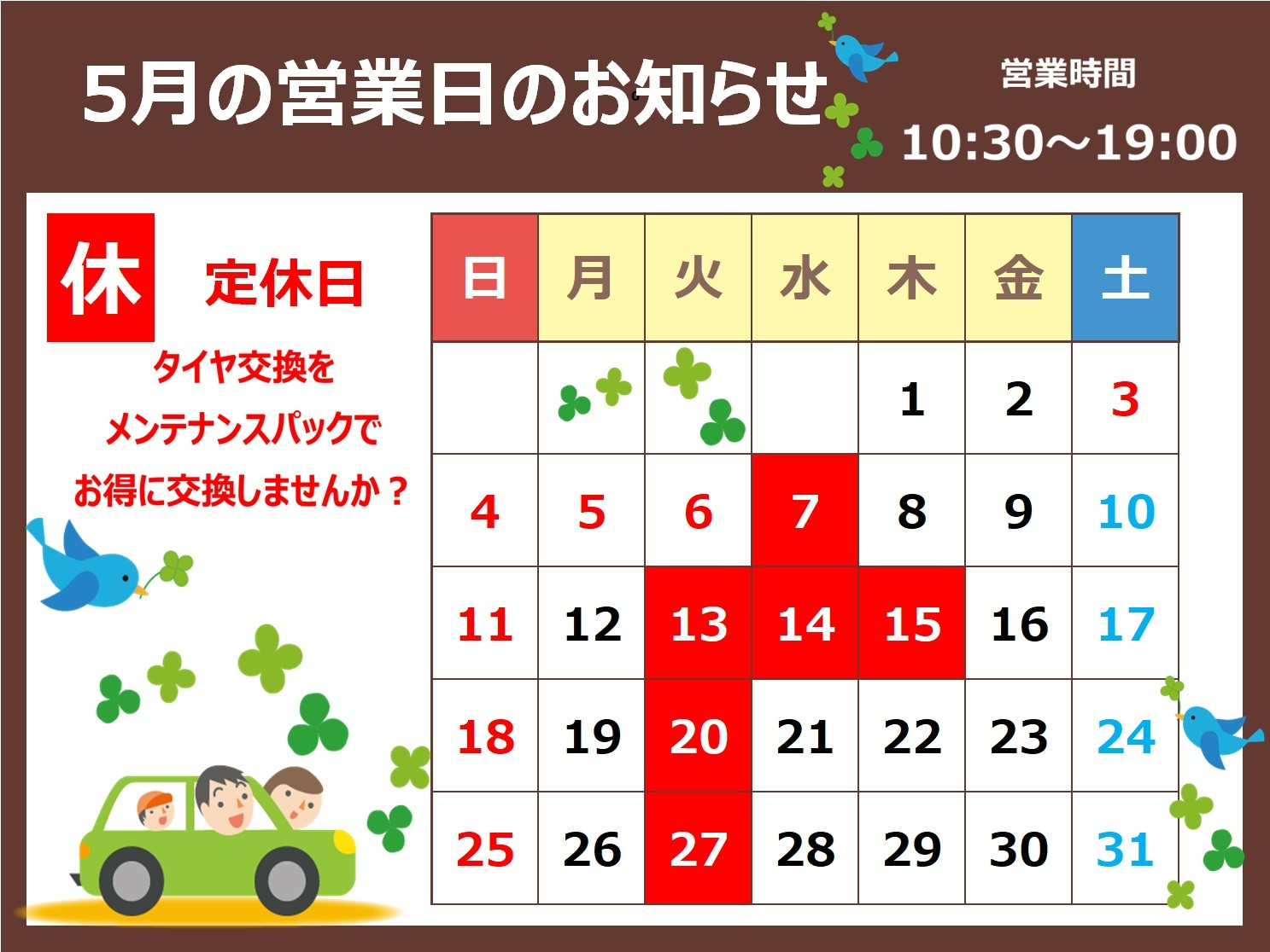 【タイヤ館 白河】5月定休日のご案内 ポスト 2025年5月1日 タイヤ館白河ホームページを ご覧いただきありがとうございます。 5月定休日のご案内 5月から、火曜日が定休日となりますが 6日㈫が営業日となり7日㈬がお休み また、13日㈫~15日㈭までお休みとなります。 定休日が不規則となり ご迷惑お掛けしますが 宜しくお願い致します。 5月もタイヤ館白河を宜しくお願い致します。 タイヤ館 白河 住所:961-0985福島県白河市和尚壇6-17 電話番号: 0248-23-6060