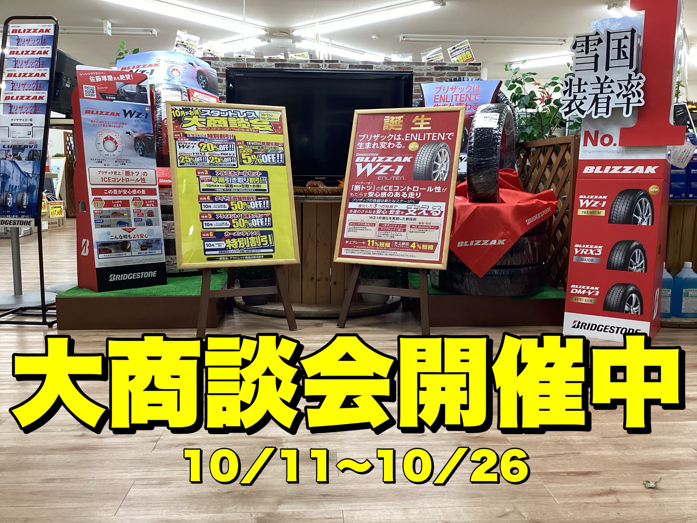 スタッドレス大商談会 本日よりスタート!! ポスト 2025年10月11日 お世話になっております。タイヤ館白河です。 本日からスタッドレス大商談会がは始まります!始まっております!! 生憎の雨でしたが、商談会初日は大盛況。 ご来店して下さった皆様。ありがとうございました。 10月26日まで開催しております。 皆様のご来店スタッフ一同、心よりお待ちしております! ※開催期間中、商談までの待ち時間が発生する事が懸念されます。 お時間には余裕を持ってご来店頂きます様、お願い申し上げます。 タイヤ館 白河 電話番号: 0248-23-6060 相談予約