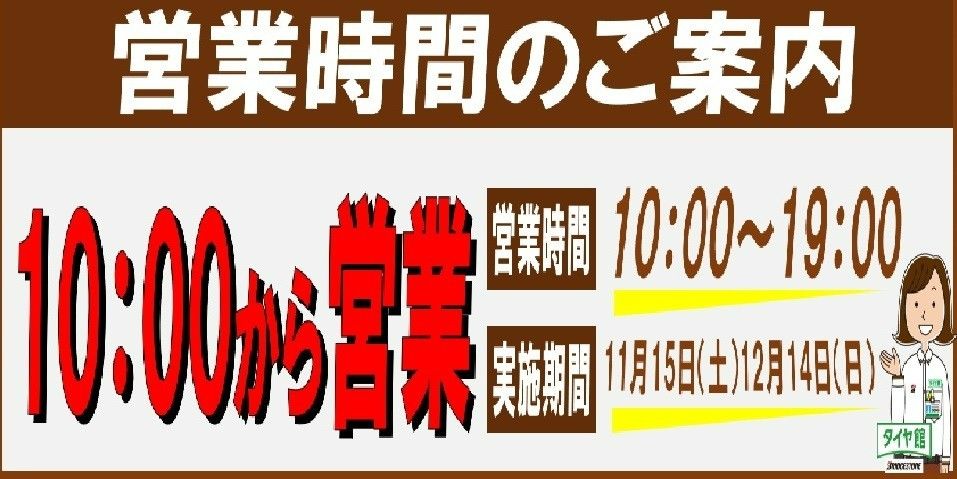 営業時間のお知らせ ポスト 2025年11月10日 11月15日(土)~12月14日(日)のハイシーズン期間限定 10:00オープンになります。 コロナやインフルエンザが流行する時期でもありますので、 開店前に店頭にお並びになる行為はなるべくお控え頂けます様お願い申し上げます。 また少人数で運営しておりますので 店頭・電話対応が遅れる場合もございます 何卒ご理解の程お願い申し上げます 相談や作業に関する予約に関しましては、 WEBから事前予約をお願い致します。 ご予約コチラから タイヤ館 白河 相談予約