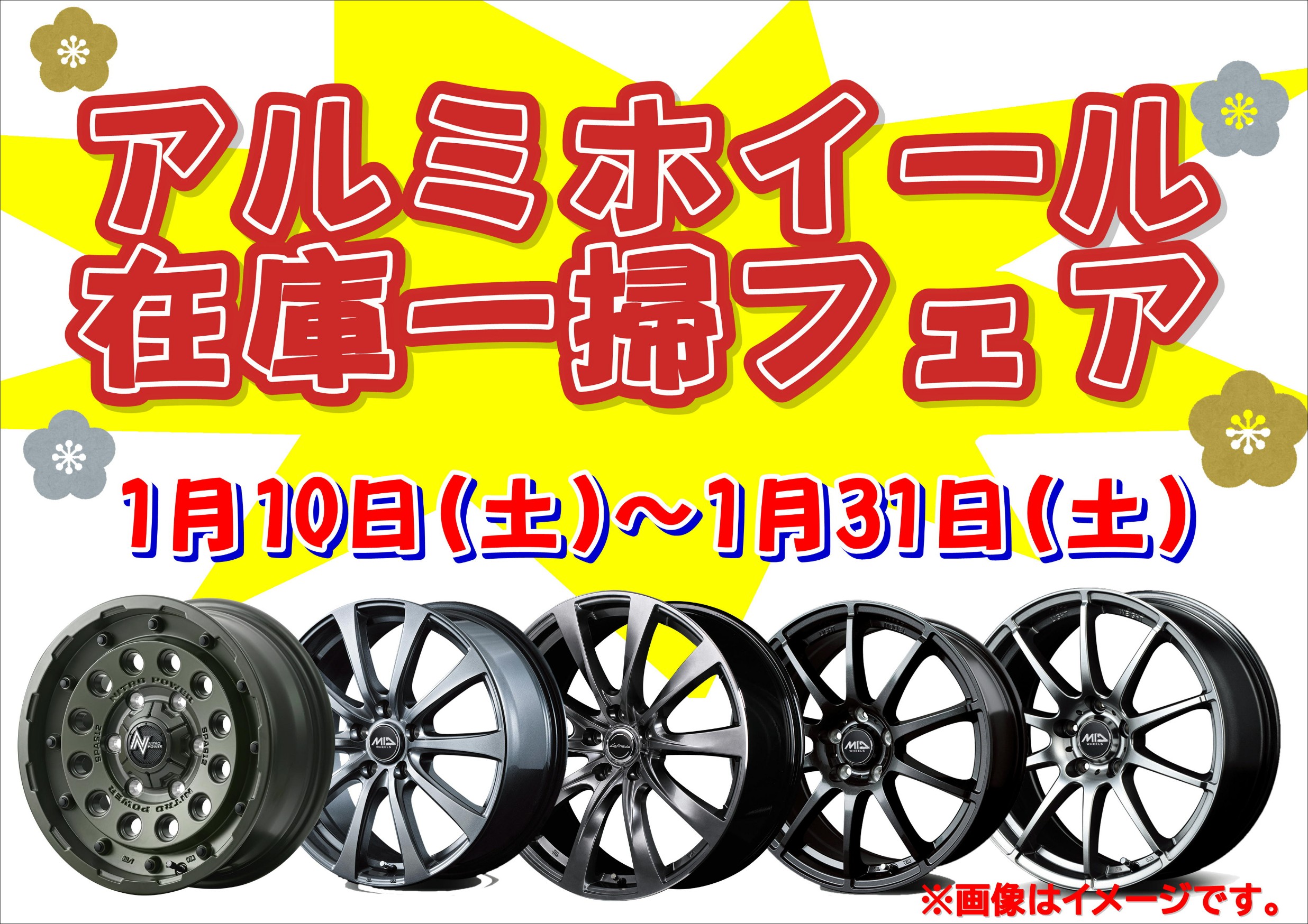 【タイヤ館 白河】白河店限定イベント始まります! ポスト 2026年1月7日 タイヤ館白河ホームページを ご覧いただきありがとうございます。 いよいよ!白河店限定イベントが始まります! まずは! 1月9日(金)~1月31日(土)まで、 エンジンオイルキャンペーンを開催! 年末年始お出掛け後、オイル交換の時期ではありませんか? 期間中、エンジンオイルがお得です! さらに! 1月10日(土)~1月31日(土)まで、 アルミホイール在庫一掃フェアも開催!! 夏用ホイールも冬用ホイールも お得になります! ぜひこの機会にご相談下さい。 皆様のご来店お待ちしております。 タイヤ館 白河 住所:961-0985福島県白河市和尚壇6-17 電話番号: 0248-23-6060 相談予約