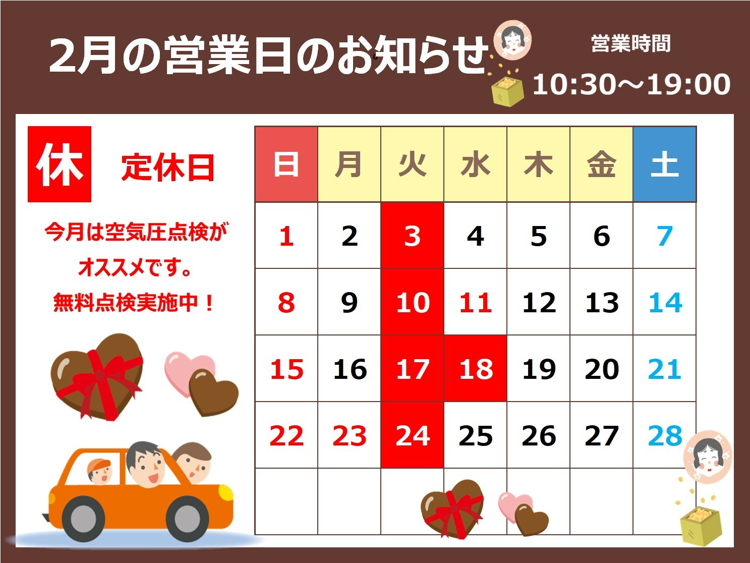 【タイヤ館 白河】1月もご来店ありがとうございました。 ポスト 2026年1月31日 2026年1月も たくさんのご来店ありがとうございました。 2月は白河店限定イベントで 【 バッテリーキャンペーン 】 【 RECAROフェア 】 開催致します。 皆様のご来店お待ちしております。 タイヤ館 白河 住所:961-0985福島県白河市和尚壇6-17 電話番号: 0248-23-6060 カテゴリ:お知らせ