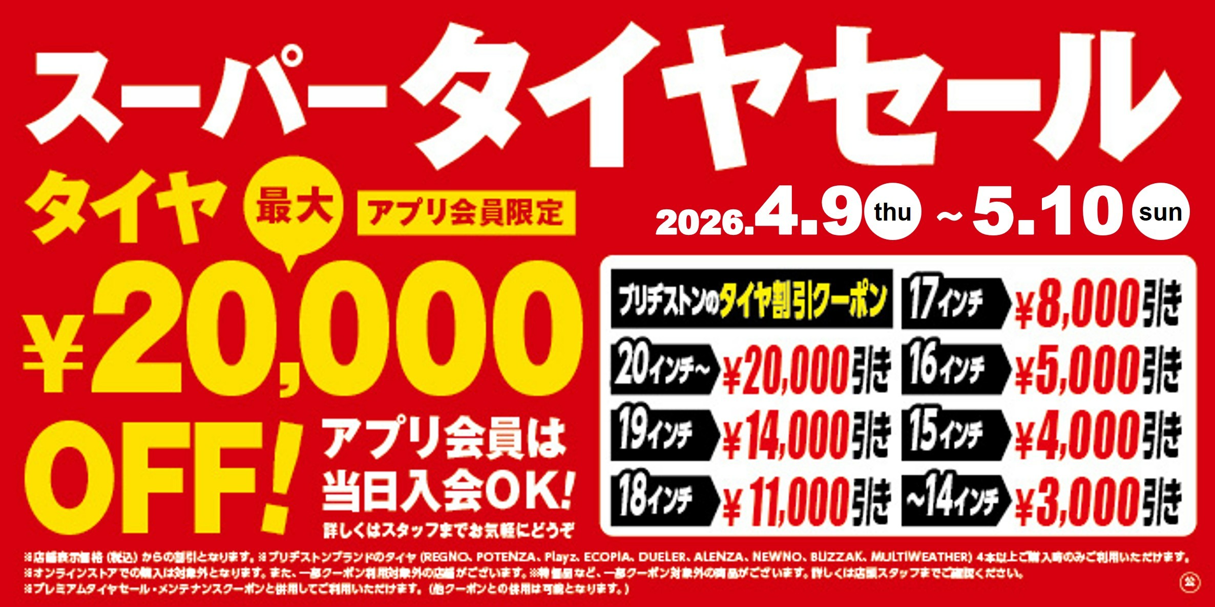ご購入タイヤのインチにより最大20,000円OFFになるクーポンが
