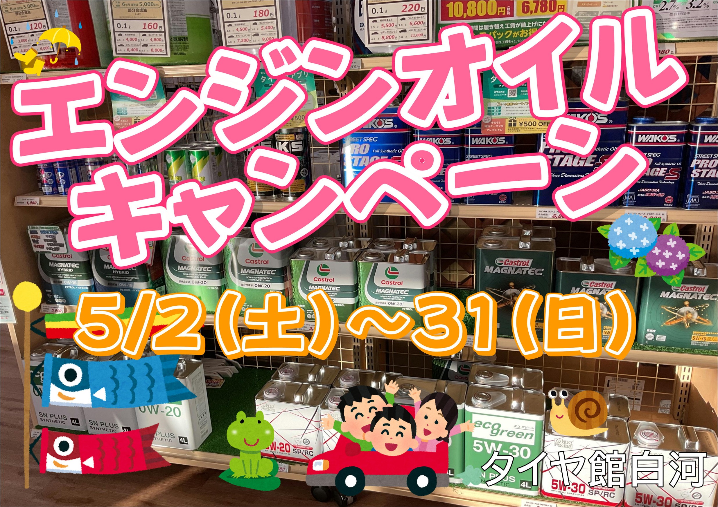 【タイヤ館 白河】4月もありがとうございました!5月のキャンペーンお知らせ! ポスト 2026年4月30日 タイヤ館白河ホームページを ご覧いただきありがとうございます。 4月もたくさんのご来店ありがとうございました。 5月のお得なキャンペーンをご案内! 【 エンジンオイルキャンペーン 】 5/2(土)~31(日)まで 20%OFF商品 ・ワコーズ (缶オイル) ・エコクリア(量り売り) ・エコマックス(量り売り) ・エコブラスト(量り売り) 10%OFF商品 ・カストール(缶オイル) ※交換工賃は割引対象外です。 RAYS × MID フェア 5/16(土)~24(日)まで 期間中でRAYSの商品も CMでおなじみのMIDも 多数展示!! 気になるあのホイールも実際に見れちゃうかも! ぜひこの機会にお越し下さい。 皆様のご来店お待ちしております。 タイヤ館 白河 住所:961-0985福島県白河市和尚壇6-17 電話番号: 0248-23-6060 カテゴリ:オイル関連 ホイール関連 その他メンテナンス