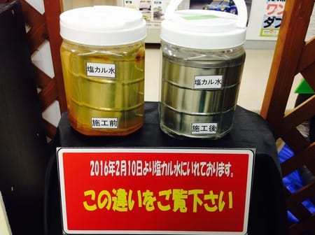 右→防サビコーティングをして塩カル水に入れた缶
