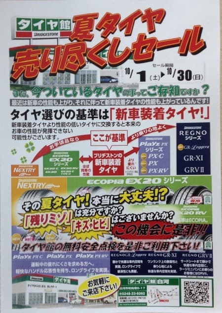売り尽くしセール実施中!! ポスト 2016年10月5日 只今、夏タイヤ、アルミホイールの売り尽くセールを実施中!(^^) タイヤはベーシックからプレミアムクラスまでが対象ですしお手頃品もございます。ホイールは14インチから19インチまでの在庫、展示品が対象です。E物をお買い得に購入するチャンスです! サイズが合えばラッキーですよね\(^o^)/物、サイズ、デザインによっては、目玉品等もございますので是非、足を運んでみては…お待ちしております。(^ ^) 担当:ヨコタ
