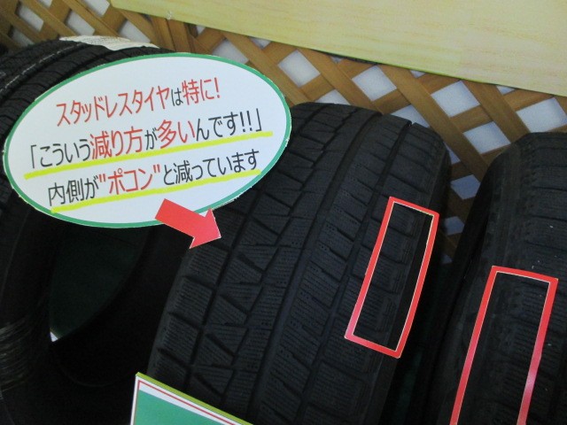 スタッドレスタイヤって内側の角が極端に減っていることが多いんです!