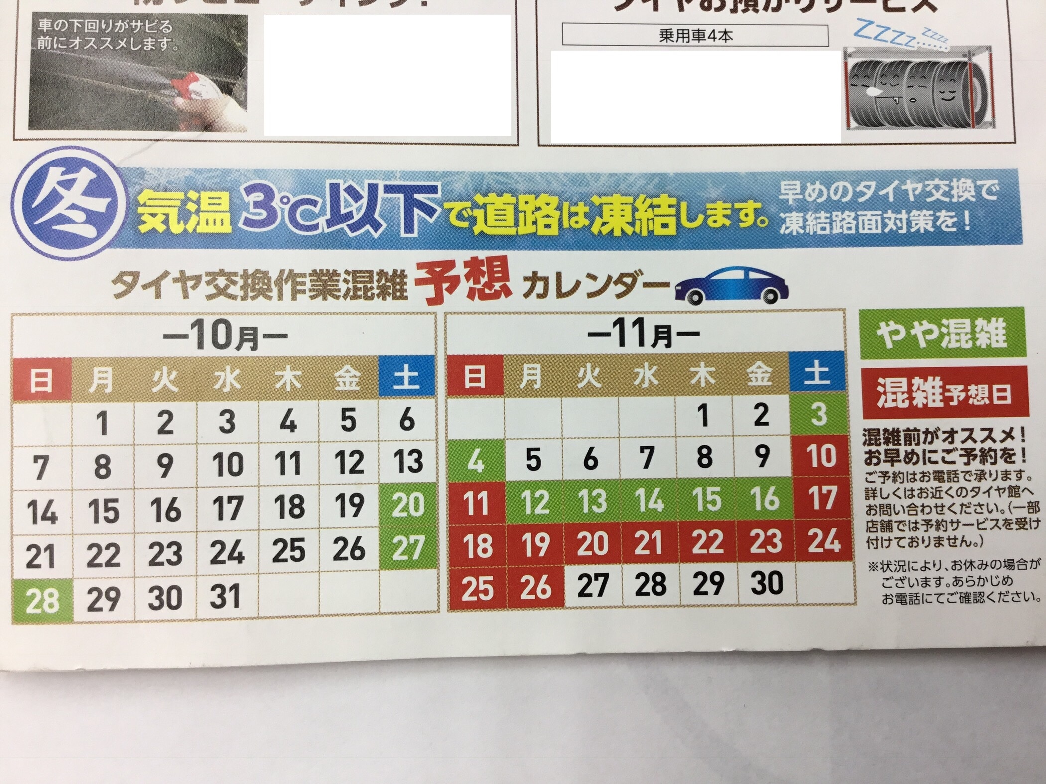 作業予約もだんだんとうまってきてます! ポスト 2018年11月12日 タイヤ交換も始まってきています! また、お電話での作業予約も増えていて、日によっては 既に予約枠がいっぱいになっている日もあります・・・ タイヤ交換の日程がお決まりの方は、2週間後でも1ヶ月後でもご予約できますので 早めにご連絡下さい!早い者勝ちです☆ また、日によってはご希望にそえない場合もございますのでご了承下さい。 タイヤ館 白河 TEL:0248(23)6060 担当:タカハシ
