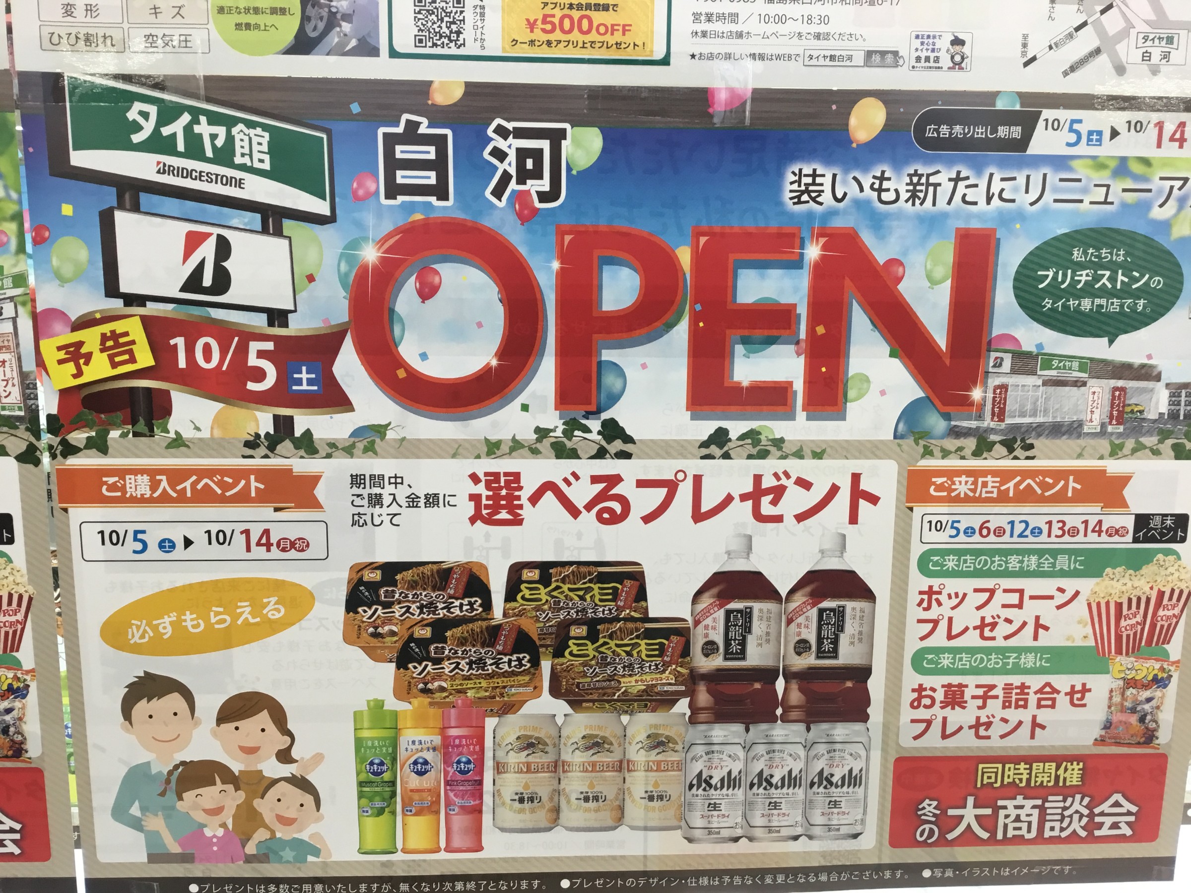 リニューアルオープンセール今日からです!!!! ポスト 2019年10月5日 皆様こんにちは。 タイヤ館白河です。 いつもWEB日記をご覧頂きありがとうございます。 今日からタイヤ館白河リニューアルオープンセールです!!! 同時開催で冬の大商談会も開催しております。 ご購入のお客様には選べるプレゼントもご用意しておりますので 皆様のご来店お待ちしております。 宜しくお願い致します。 タイヤ館 白河 電話. 0248-23-6060 お店に電話する まずはお問い合わせだけでも!お気軽にお電話ください!