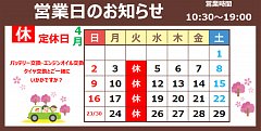 いつも当店をご利用いただきありがとうございます。 勝手ではありますが、 4月4日(火曜日)は定休日となります。 ご理解の程よろしくお願いします。