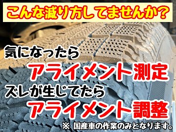 タイヤ交換も本格的になって来ましたが 交換する夏タイヤ、交換した冬タイヤ摩耗はどうですか? 写真のようにギザギザしてませんか? してそうな…してなそうな… 気になったら、まずはアライメント測定してみませんか? 見た目だけでなく、数値でしっかり判断いただけます。 タイヤの性能、車の性能...