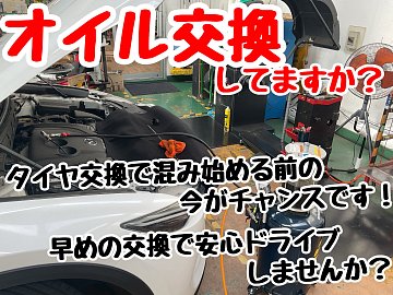 だんだんとタイヤ交換の予約も増えてきましたが、 オイル交換は大丈夫ですか? タイヤ交換と同時に作業はもちろん大丈夫ですが、 タイヤ交換時期は、混み合い作業時間も多くかかってしまう事もございます。 お時間の有効利用の為にも混雑を避けた今がチャンスです。 事前予約頂けるとよりお時間を無...