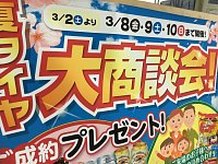 3月8・9・10日は何の日でしょうか? 「夏タイヤ大商談会」の日です! 当日お越しになれないお客様に朗報です。 3月2日~やってますので 夏タイヤ・冬タイヤ等問わずたくさんのご来店お待ちしております。 使えるかどうか気になるお客様は ぜひタイヤをお持ちの上ご来店お待ちしております。