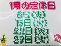 こんにちはー!! 今日は成人の日ですね。 成人を迎えられた皆様、おめでとうございます☆ さて、遅くなってしまいましたが、 今月の定休日をお知らせいたします。 1月15日(火)・22日(火)・29日(火) と、昨年と変わらず火曜定休となりますので、 宜しくお願い致します。