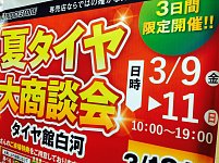 タイヤ館 白河WEBをご覧いただき ありがとうございます。 今年も「夏タイヤ大商談会」の開催が決定致しました!! 3月9日(金)~3月11日(日)の3日間の限定開催! タイヤ、ホイール、足まわり、オーディオ・ナビ等、 大変お得な3日間となっております! また、お買い上げ金額に応じて必ずもらえる...