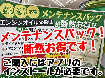 オイル交換はお済みですか? オイル交換と一緒にその他のメンテナンスもお考えであれば 『 メンテナンスパックがおすすめです! 』 オイル交換2回+エレメント1個 選べるメニューで エアコンフィルターやヘッドライトコーティングなどが選べます! ご利用にはアプリのご登録が必要です。 詳しくは...