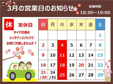2月もタイヤ館白河ご利用、ご来店して頂いたお客様 誠にありがとうございました。 いよいよ夏タイヤの準備をする時期となりました。 皆さまの安心安全なカーライフのお手伝いができたら幸いです。 3月も沢山のお客様にお会いできるのを楽しみにしております。 店主 ~ 3月定休日のご案内 ~ 3月は...